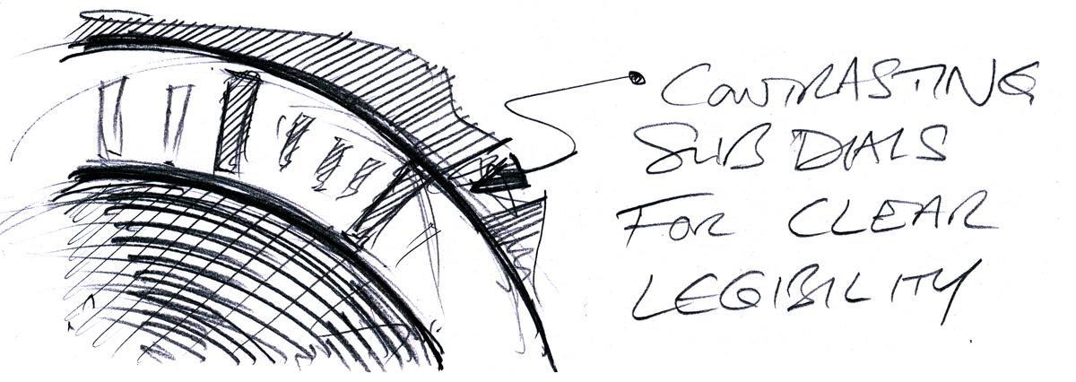 Otoczona skalą tachometru, ożywiona nawiązaniem stylistycznym do desek rozdzielczych oldtimerów tarcza zegarka zapewnia doskonałą czytelność wskazań dzięki dużym oznaczeniom cyfrowym godzin, oraz szerokim wskazówkom, zawierającym w środkowej części przestrzeń z białą substancją luminescencyjną.