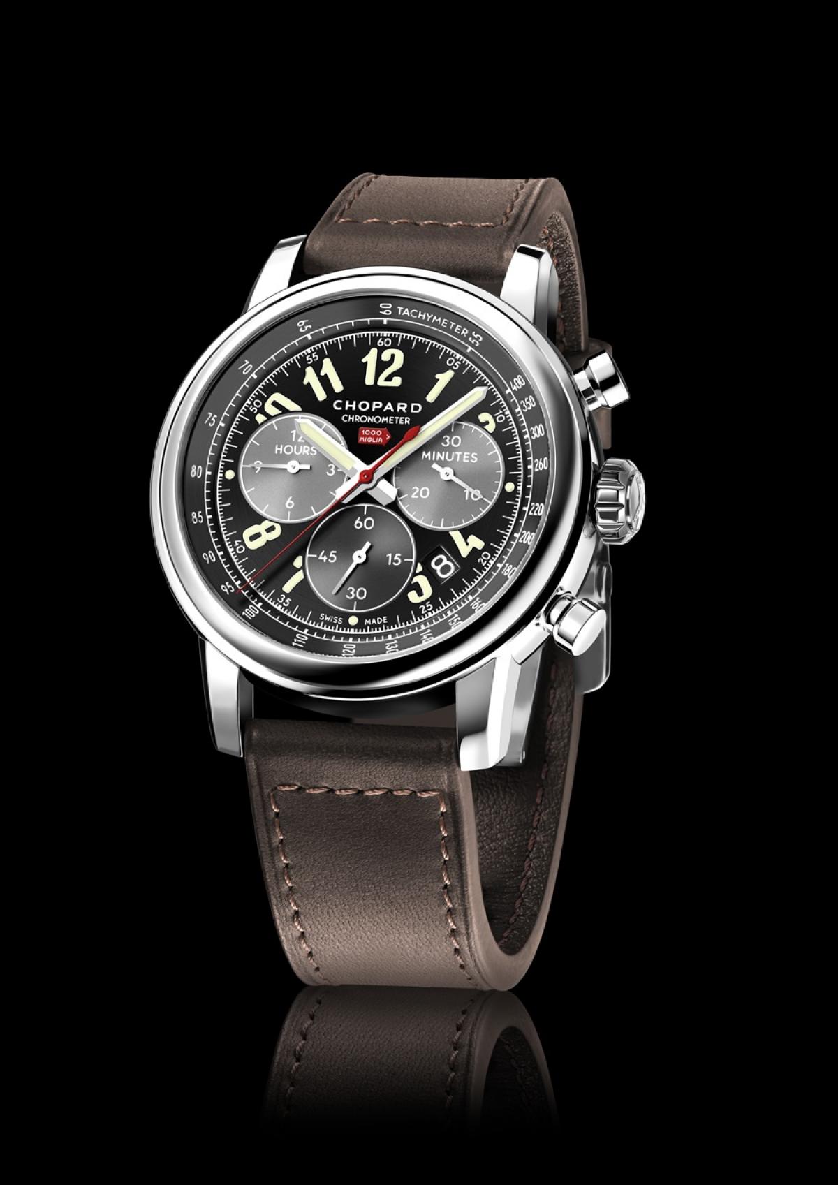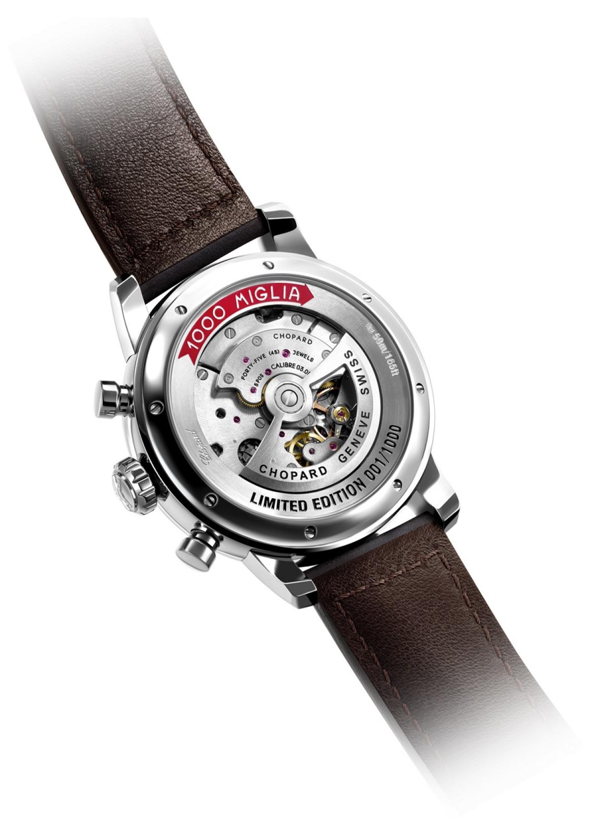 Skala tachometru zwieńczająca zegarkową tarczę jest niezbędna przy obliczaniu średniej prędkości pokonywania kilometrowych odcinków trasy, a właśnie stabilna, wcale nie największa prędkość jest czynnikiem decydującym w rywalizacji w rajdzie Mille Miglia. Satynowane mini wskaźniki umieszczone na tarczy są ewidentnym odwołaniem do stylistyki starszych kokpitów samochodowych. Wspomniany już powyżej czerwony kolor wskazówki sekundowej pojawia sie także w logotypie wyścigu umieszczonym poniżej wskazania godziny dwunastej na tarczy, oraz na pierścieniu będącym elementem dekla zegarka. Dodatkowym odwołaniem do świata klasycznych wyścigów samochodowych jest robiący wrażenie lekko wyblakłego, wykonany ze skóry cielęcej pasek Suportlo®. Jego wodoodporność i elastyczność przypomina skórzane pasy spinające maski starych wyścigowych samochodów.