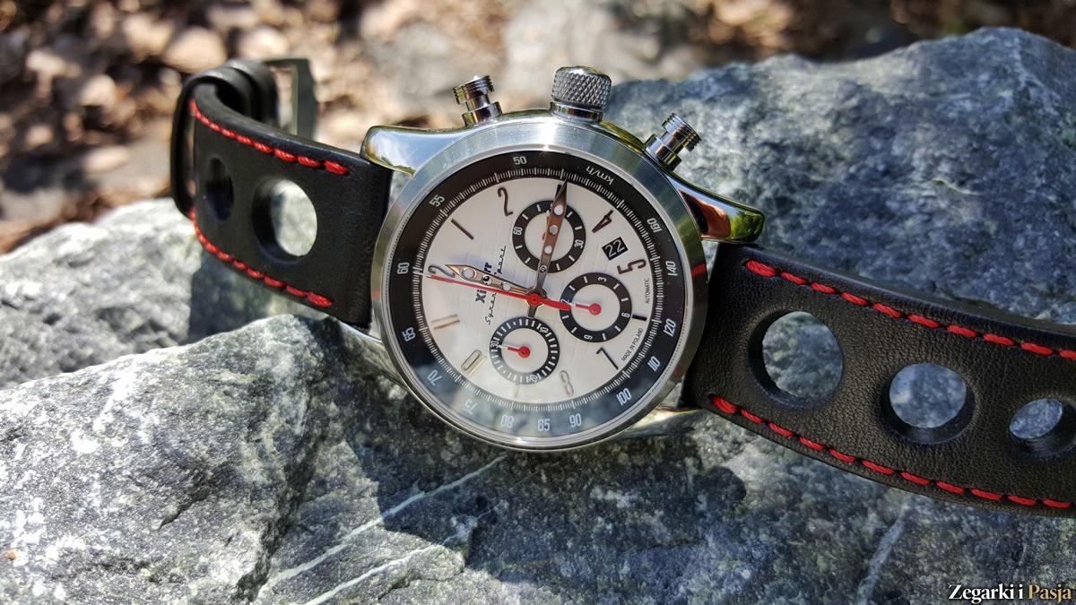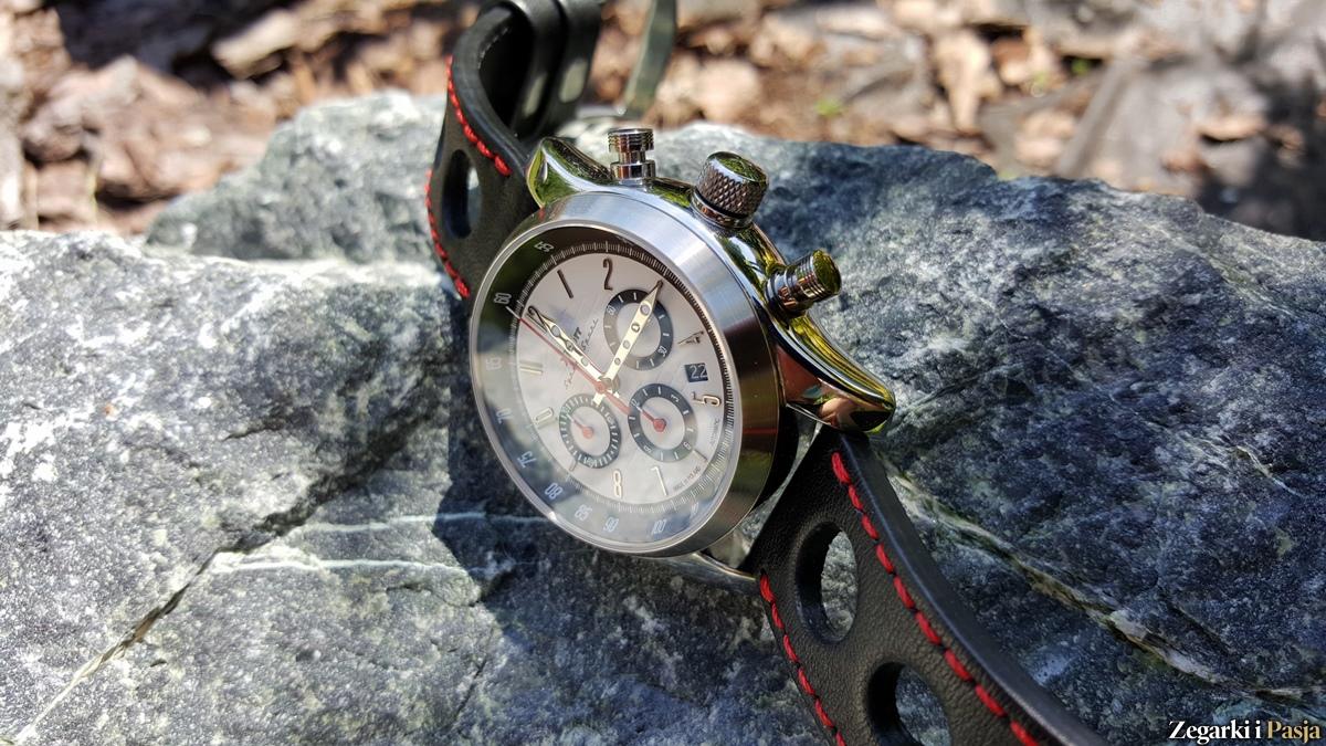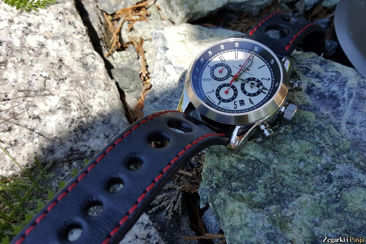 Zastosowany oryginalnie w zestawie pasek typu rally, z typowymi, okrągłymi dziurami, zawsze dobrze współgra z wszelkiej maści sportowymi zegarkami wyposażonymi w funkcję stopera.
