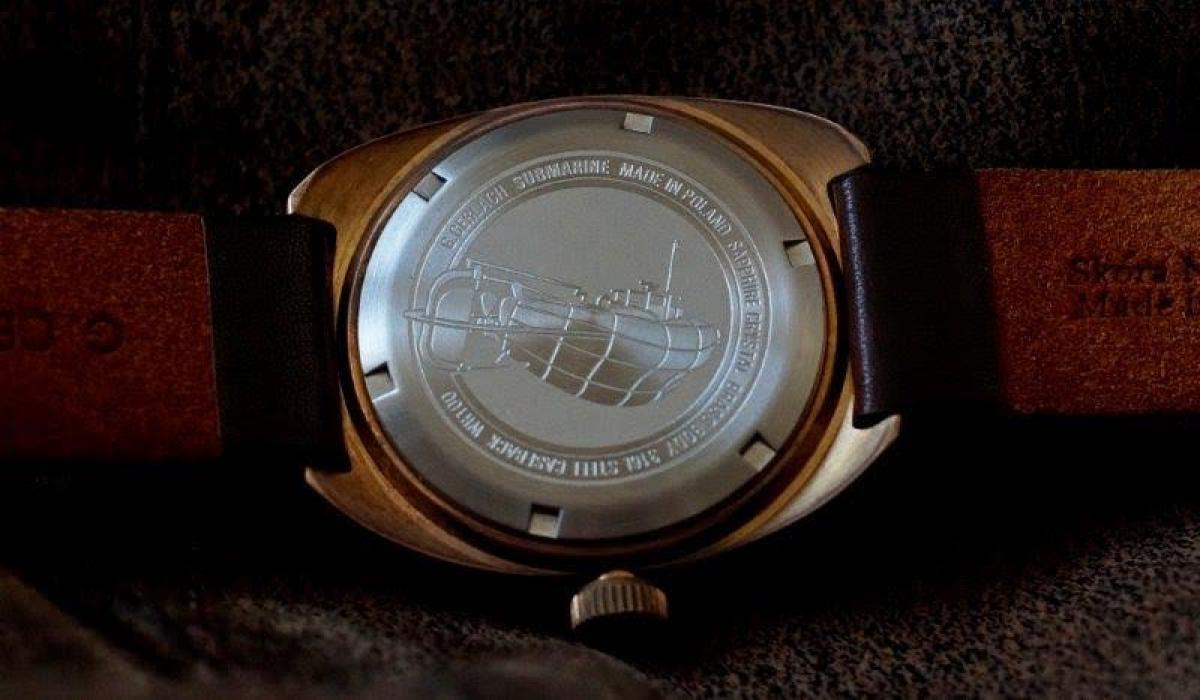 Koperta tego wspaniałego zagarka wykonana jest właśnie z utleniającego się mosiądzu który zadziwiająco dobrze komponuje się ze stalowym (316L) deklem na którym znajduje się wierunek łodzi podwodnej. Koperta 43x49mm tworzy spójną całość z zakręcaną kopronką, umieszczoną przy godzinie 3. Wodoszczelność tego cuda to aż 100 metrów.