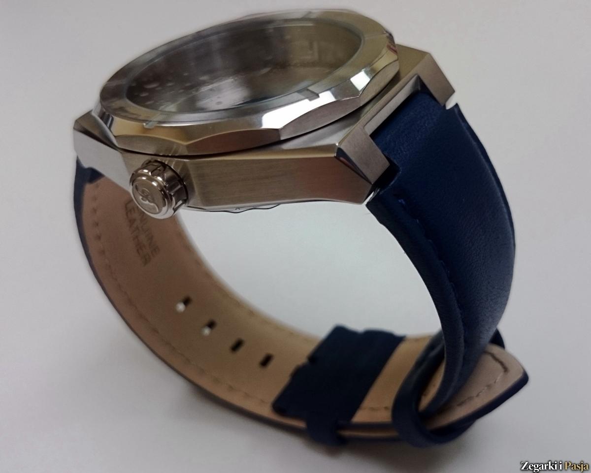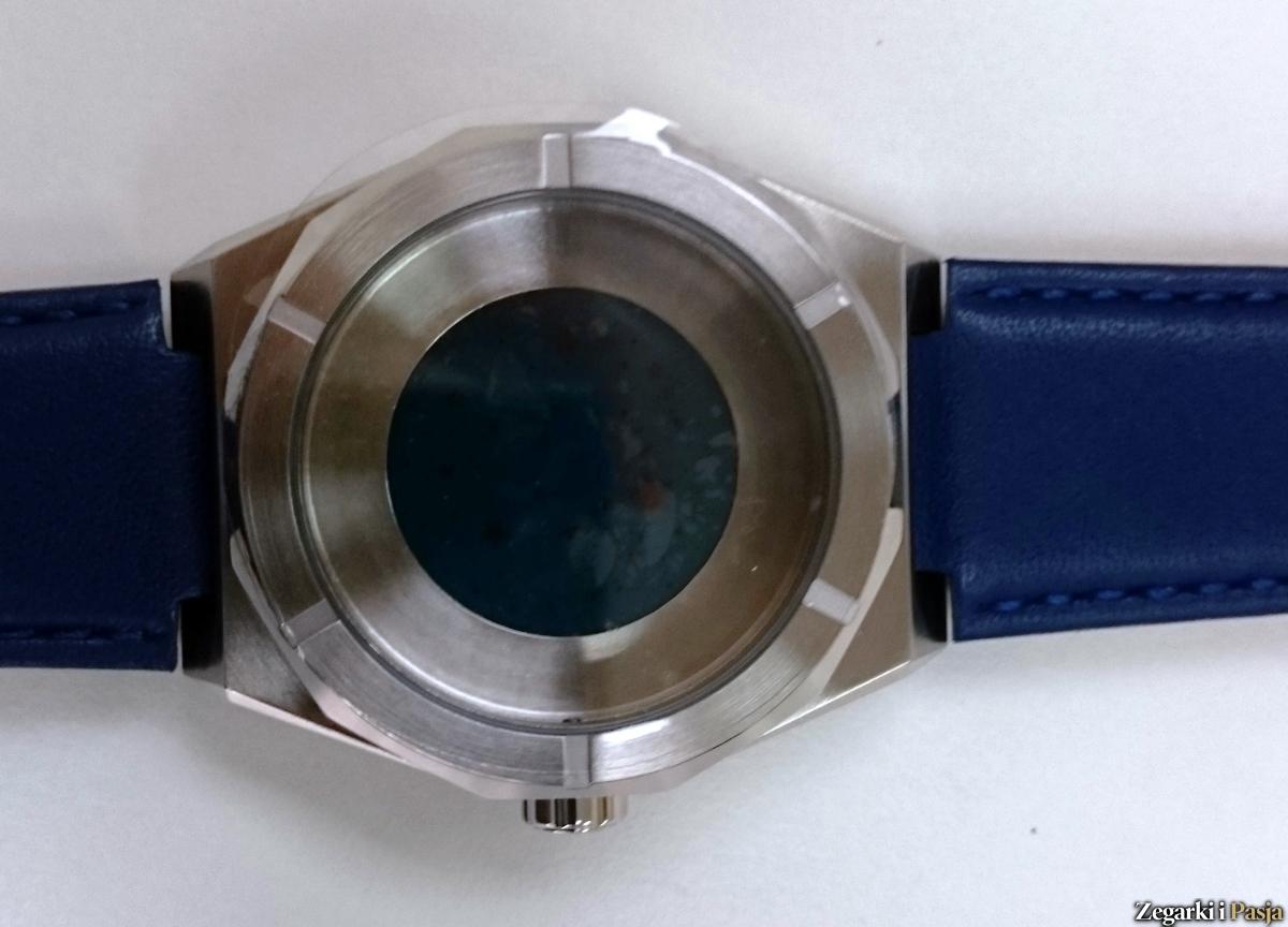 Koperta wykonana jest oczywiście ze stali nierdzewnej, szczotkowanej z polerowanymi krawędziami, i posiada wymiary 42 mm x 50,5 mm.