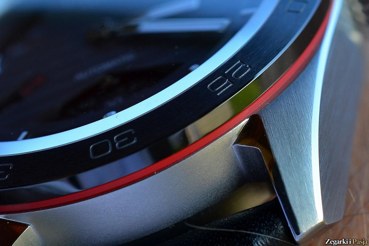 Pomiędzy ceramiczna lunetą, a stalową kopertą jest wolna przestrzeń, która jest w kolorze czerwonym, podkreślając dynamiczny i sportowy charakter zegarka. W lunecie zamocowane jest szafirowe szkło z wewnętrzną powłoką antyrefleksyjną.