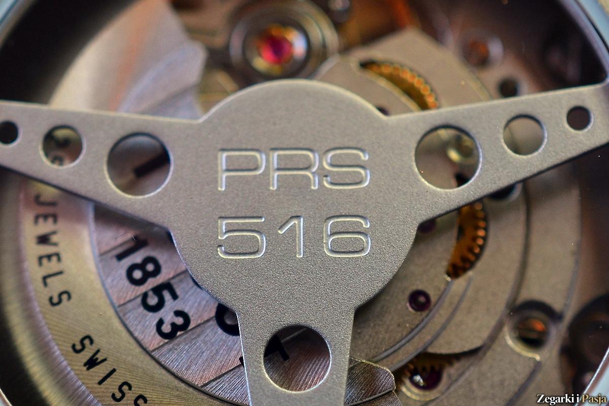 Powoduje to także, że mamy do czynienia z zegarkiem, w którym na całokształt działa ogromna ilość szczegółów, detali. Pasy genewskie, tarcze, wiszące indeksy, szlify. Nawet umieszczony na godzinie 4-tej datownik ze wskazaniem dnia miesiąca na czarnym tle ma swoje lustrzane niejako odbicie na godzinie 8-ej w postaci zagłębionego, jak w okienku daty, napisu PRS i wyżej czerwonemu 516 współgrającemu z czerwonym trójkącikiem przy dacie.
