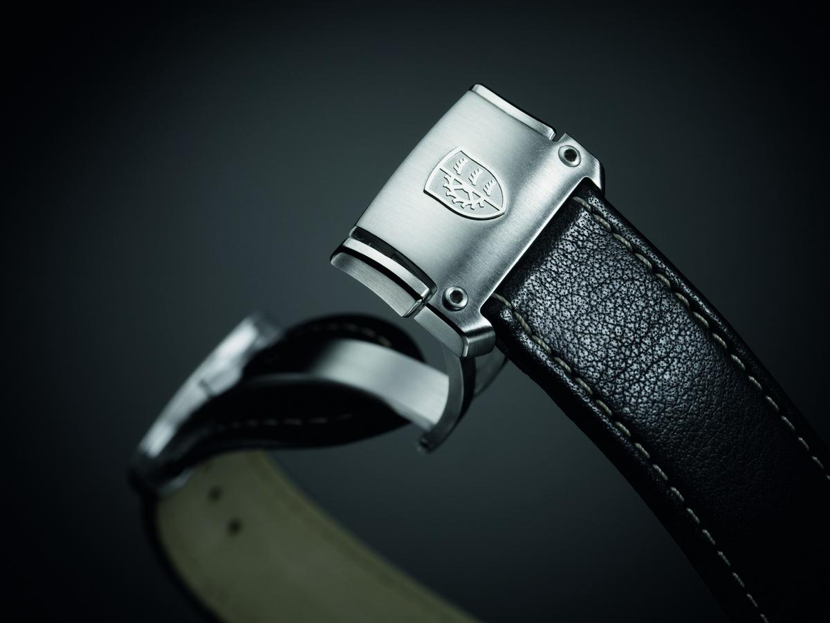 Ten model jest na cielęcym pasku i ma dodatkowo lunetę i dekiel pokryte czarną powłoką PVD. Paski zapinane są na motylkową, świetnie wykonaną klamrę z logo Erhard Junghans.