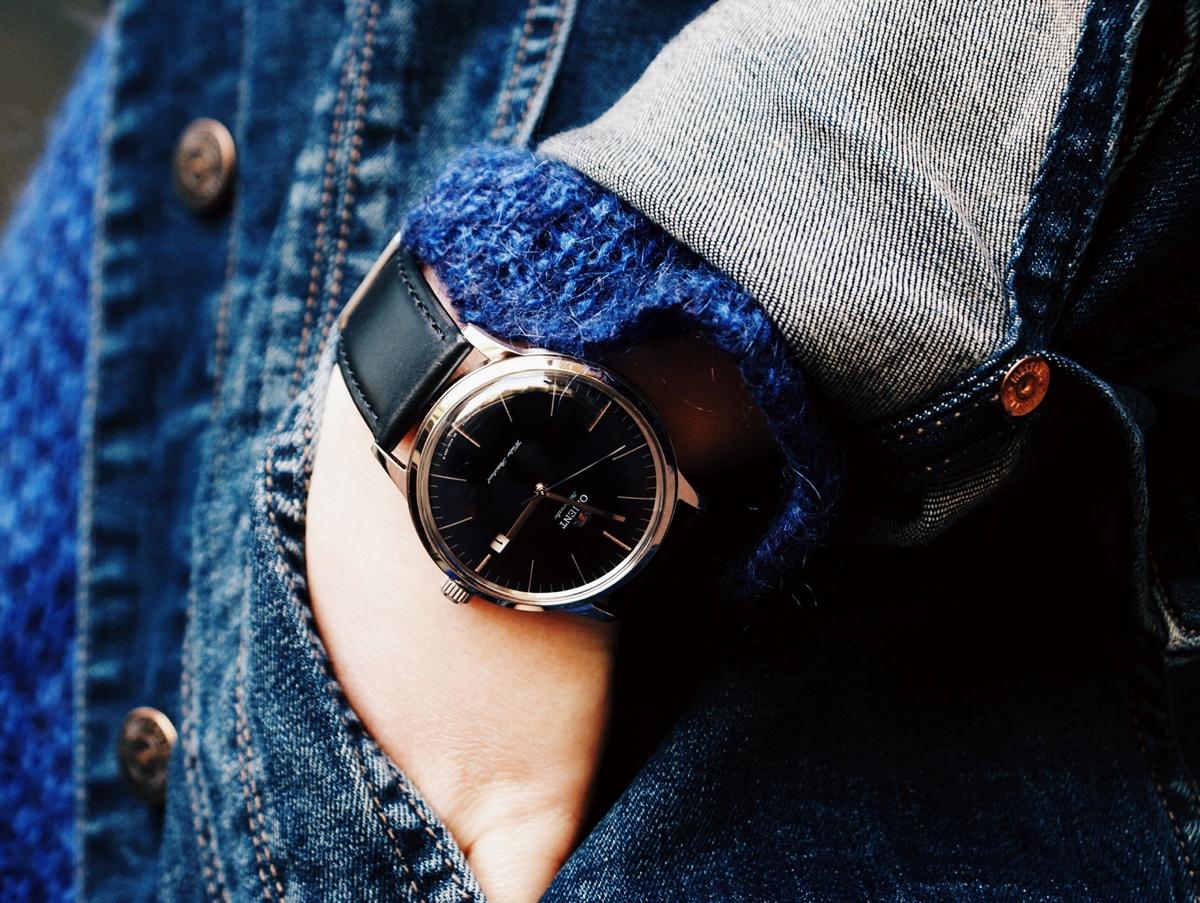 Suma tych „warstw” to niemałe 11,8 mm. Niby żadna rewelacja i tego można było się spodziewać po tak wypukłym szkle i masywnym mechanizmie. Jednak to naprawdę mistrzowski projekt. Zegarek wygląda, nawet leżąc na stole, na dużo bardziej płaski, a założenie go na rękę jeszcze potęguje to odczucie. Staje się on typowym, klasycznym „garniturowcem”. Wydaje się jakby jego grubość była sporo mniejsza niż 10 mm.