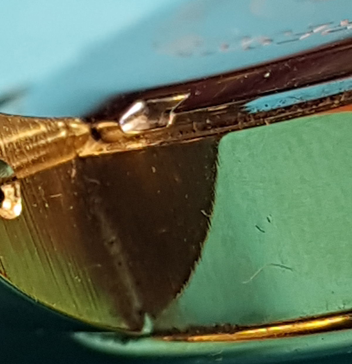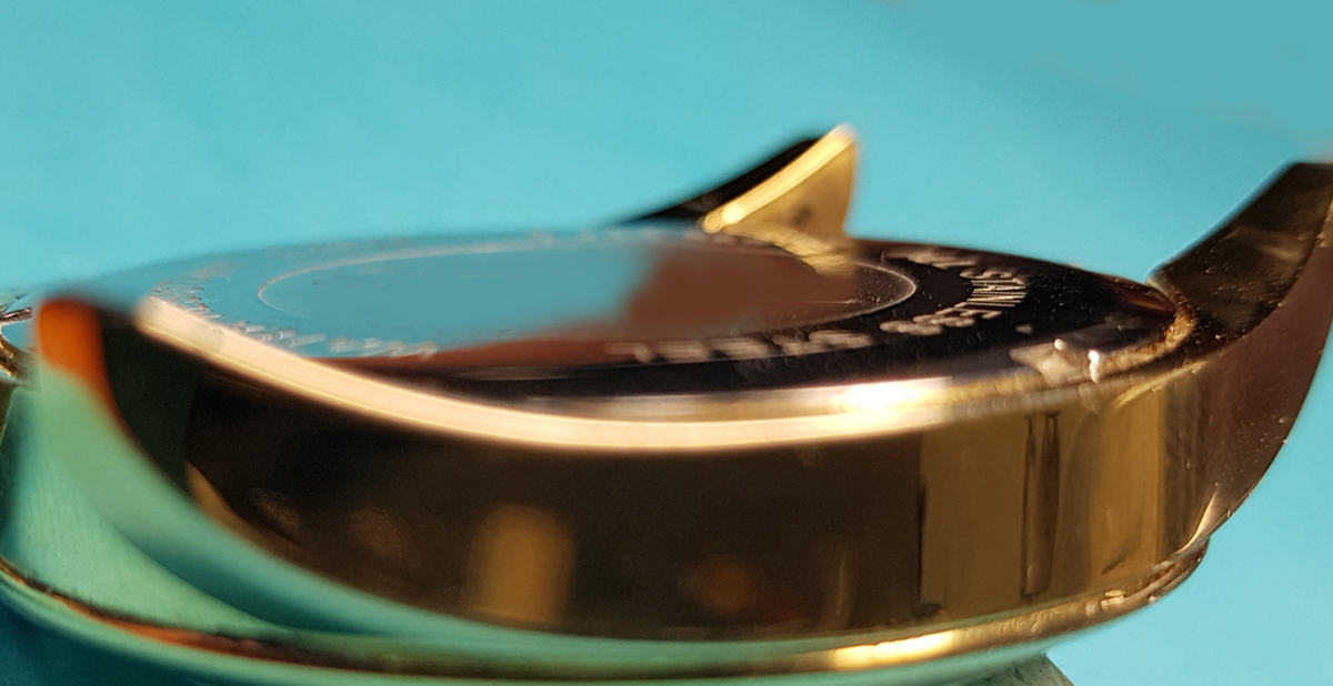 W pozostałej części obwodu płaszczyzna koperty jest powyżej dna gniazd dekla. Bardzo blisko dekla jest także koronka zegarka.