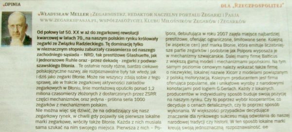 Redakcja działu Dobra firma - dodatku do Rzeczpospolitej na okazję przygotowywanego artykułu o polskich zegarkach Błonie, poprosiła nas o wypowiedź na temat sytuacji ogólnej na tym polu zegarkowego rynku. Artykuł „Polskie zegarki z tradycjami”, oraz nasza opinia została opublikowana w dodatku Dobra firma w dniu 5. czerwca 2017.
