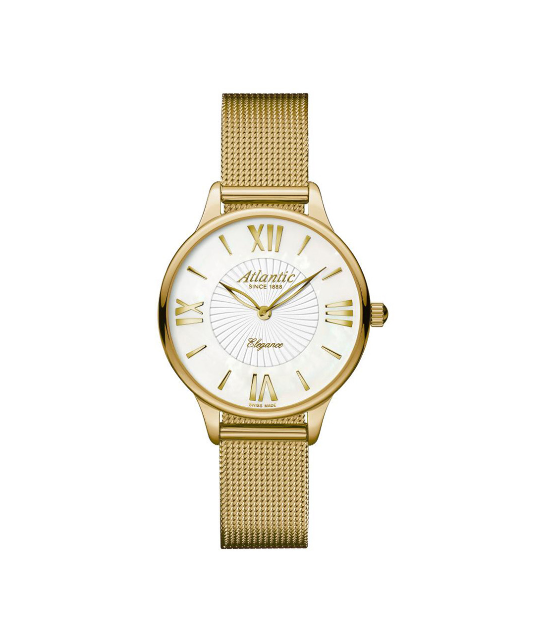 Zegarek Atlantic Elegance 29038.45.08MB to elegancki zegarek na złotej bransolecie typu mesh. Pozłacana koperta otrzymała rozmiar 34 mm, co jest wartością optymalną dla tego typu czasomierzy i wykonana została ze stali szlachetnej 316L. Stal jest materiałem bardzo wytrzymałym, poddającym się dość łatwej obróbce, co pozwala na tworzenie kopert i bransolet o niesamowitych kształtach. Wykonana z drobnych ogniw meshowa bransoleta, została idealnie dopasowana do obudowy, dzięki czemu możemy liczyć na bardzo wysoki komfort użytkowania. Na uwagę zasługuje bardzo wygodne zapięcie, które ułatwia zakładanie i zdejmowanie zegarka. Tarcza otrzymała wyraziste indeksy oraz wskazówki w złotym kolorze, które idealnie kontrastują ze srebrną, bardzo czytelną tarczą zegarka. Odpowiednio wykonany cyferblat ożywia czasomierz i nadaje mu odpowiedniego charakteru. W celu zapewnienia odpowiedniej przejrzystości oraz wytrzymałości Atlantic stosuje najwyższej jakości szkła szafirowe, które oferują celującą wręcz odporność na zarysowania. Wodoszczelność została ustalona na poziomie 30 m/3 ATM, co wydaje się być wartością wręcz idealną. Zachlapanie, mycie rąk a nawet deszcz nie będą mieć wpływu na pracę mechanizmu. Czasomierz napędzany jest poprzez najwyższej jakości szwajcarski mechanizm kwarcowy zasilany baterią. Jest to oczywiście mechanizm, który zapewni nam precyzję i dokładność chodu na najwyższym poziomie.