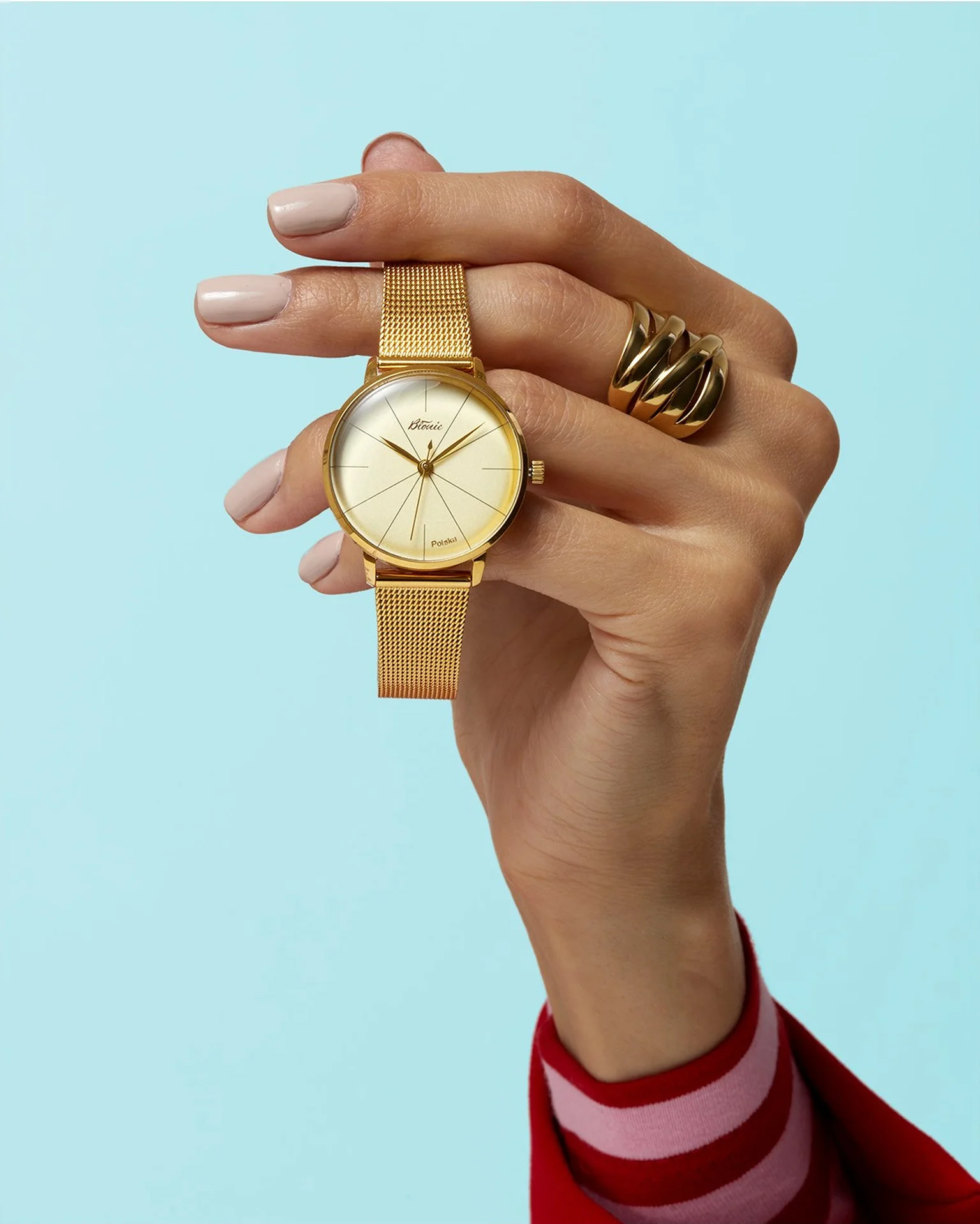 Zodiak Damski nawiązuje do swojego pierwowzoru, zachowując charakterystyczne linie przecinające tarczę, podwójnie wypukłe szkło oraz cienki profil koperty. Panie i Panowie – oto pierwszy damski model zegarka w historii marki Błonie!