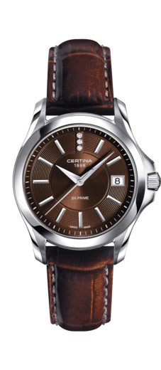 Zegarek Certina DS Prime C004.210.16.296.00 to klasyczny zegarek z okrągłą tarczą na brązowym pasku wykonanym ze skóry cielęcej. Koperta otrzymała rozmiar 32,7 mm, co jest wartością optymalną dla tego typu czasomierzy i wykonana została ze stali szlachetnej 316L. Stal jest materiałem bardzo wytrzymałym, poddającym się dość łatwej obróbce, co pozwala na tworzenie kopert i bransolet o niesamowitych kształtach. Skórzany pasek z przeszyciem został idealnie dopasowany do obudowy, dzięki czemu możemy liczyć na wysoki komfort użytkowania. Tarcza otrzymała wyraziste indeksy oraz wskazówki w srebrnym kolorze, które idealnie kontrastują z brązową, bardzo czytelną tarczą zegarka. Odpowiednio wykonany cyferblat oraz diamenty umieszczone na godz. 12 ożywiają czasomierz i nadają mu odpowiedniego charakteru. Wodoszczelność została ustalona na poziomie 100 m/10 ATM, co wydaje się być wartością wręcz idealną. Zachlapanie, mycie rąk a nawet deszcz nie spowodują przykrych dolegliwości, które mogą mieć wpływ na pracę mechanizmu. Czasomierz napędzany jest poprzez najwyższej jakości szwajcarski mechanizm kwarcowy zasilany baterią. Jest to oczywiście mechanizm, który zapewni nam precyzję i dokładność chodu na najwyższym poziomie.