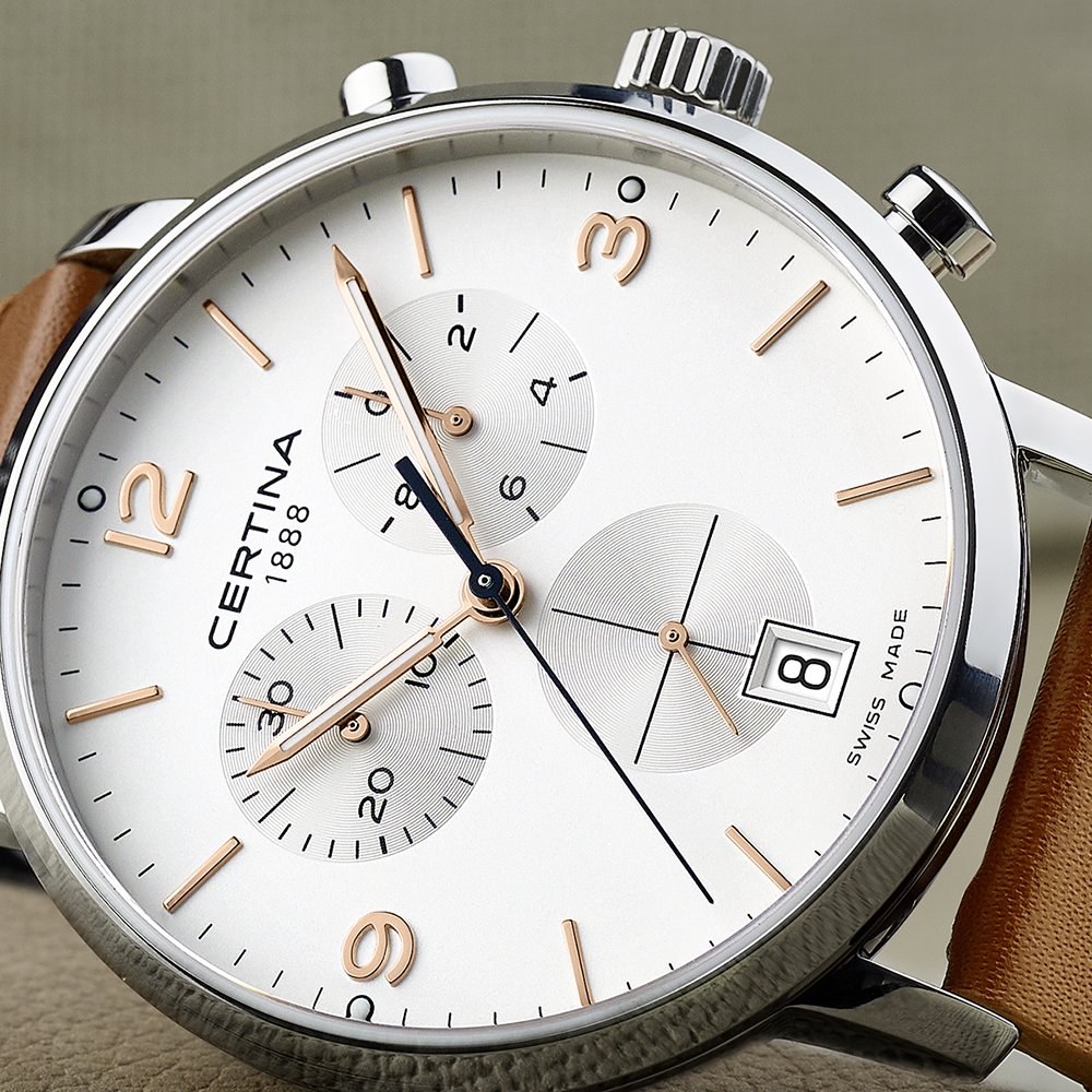 Zegarek Certina DS Caimano Chrono C035.417.16.037.01 to klasyczny zegarek z okrągłą tarczą na skórzanym brązowym pasku. Koperta otrzymała rozmiar 42 mm, co jest wartością optymalną dla tego typu czasomierzy i wykonana została ze stali szlachetnej 316L. Stal jest materiałem bardzo wytrzymałym, poddającym się dość łatwej obróbce, co pozwala na tworzenie kopert i bransolet o niesamowitych kształtach. Perfekcyjnie wykonany skórzany pasek został idealnie dopasowany do obudowy, dzięki czemu możemy liczyć na bardzo wysoki komfort użytkowania. Tarcza otrzymała wyraziste indeksy oraz wskazówki w złotym kolorze, które idealnie kontrastują z jasną, bardzo czytelną tarczą zegarka. Odpowiednio wykonany cyferblat, okienko datownika i liczniki chronografu ożywiają czasomierz i nadają mu odpowiedniego charakteru. Wodoszczelność została ustalona na poziomie 100 m/10 ATM, co wydaje się być wartością wręcz idealną. Zachlapanie, mycie rąk a nawet deszcz nie spowodują przykrych dolegliwości, które mogą mieć wpływ na pracę mechanizmu. Czasomierz napędzany jest poprzez najwyższej jakości szwajcarski mechanizm kwarcowy zasilany baterią. Jest to oczywiście mechanizm, który zapewni nam precyzję i dokładność chodu na najwyższym poziomie.