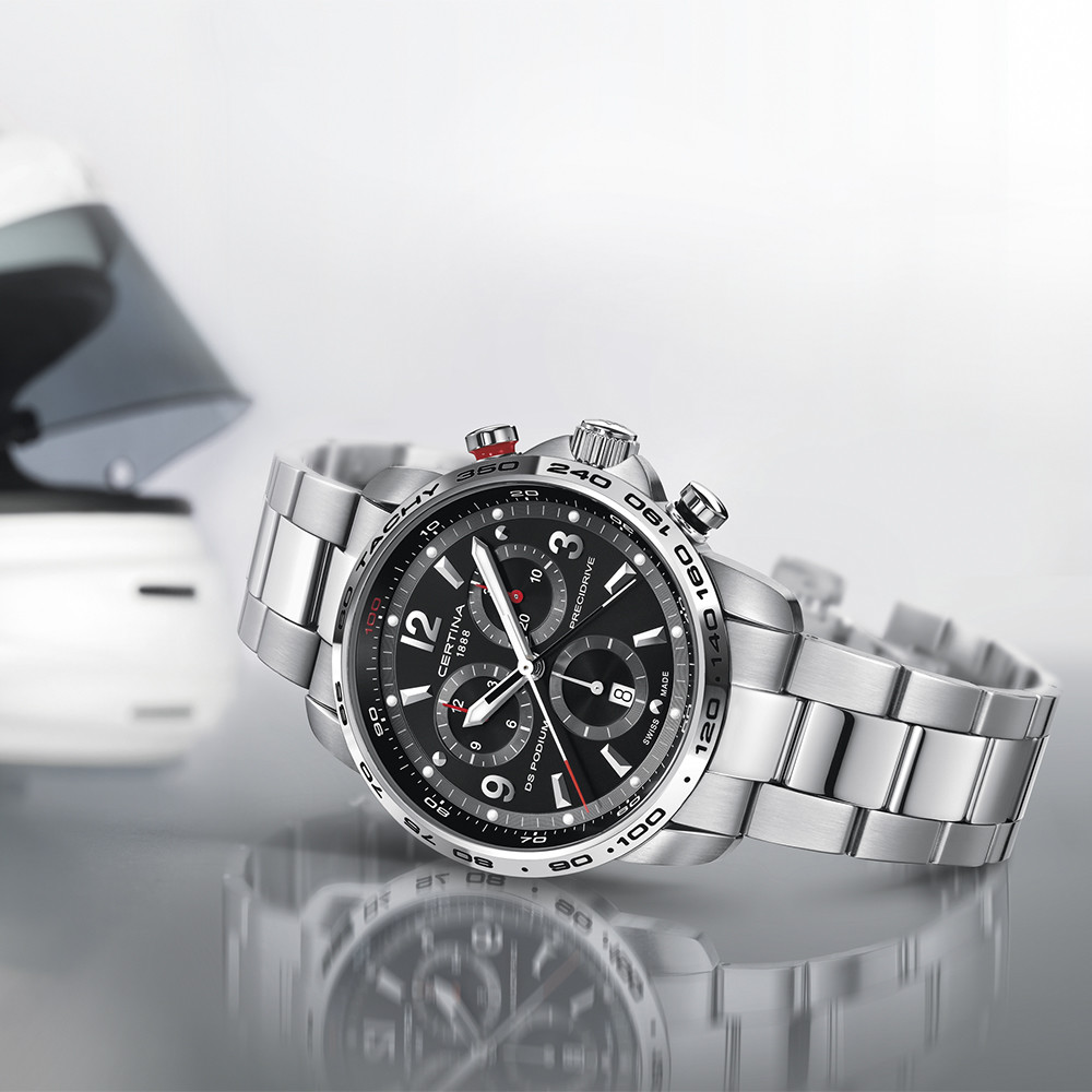 Zegarek Certina DS Podium Chronograph 1/100 sec C001.647.11.057.00 to sportowy zegarek z okrągłą tarczą na stalowej bransolecie. Koperta otrzymała rozmiar 44 mm, co jest wartością optymalną dla tego typu czasomierzy i wykonana została ze stali szlachetnej 316L. Stal jest materiałem bardzo wytrzymałym, poddającym się dość łatwej obróbce, co pozwala na tworzenie kopert i bransolet o niesamowitych kształtach. Polerowana bransoleta została idealnie dopasowana do obudowy, dzięki czemu możemy liczyć na bardzo wysoki komfort użytkowania. Tarcza otrzymała wyraziste indeksy oraz wskazówki w srebrnym kolorze, które idealnie kontrastują z grafitową, bardzo czytelną tarczą zegarka. Odpowiednio wykonany cyferblat, datownik oraz liczniki stopera ożywiają czasomierz i nadają mu odpowiedniego charakteru. Wodoszczelność została ustalona na poziomie 200 m/20 ATM, co wydaje się być wartością wręcz idealną. Zachlapanie, mycie rąk, a nawet deszcz nie spowodują przykrych dolegliwości, które mogą mieć wpływ na pracę mechanizmu. Czasomierz napędzany jest poprzez najwyższej jakości szwajcarski mechanizm kwarcowy zasilany baterią. Jest to oczywiście mechanizm, który zapewni nam precyzję i dokładność chodu na najwyższym poziomie.