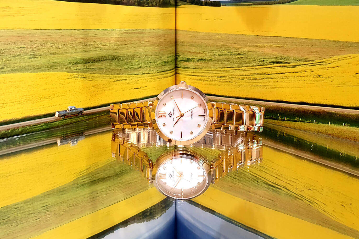 Zegarek Continental 19601-LT202500 to klasyczny zegarek z okrągłą tarczą na pozłacanej bransolecie. Koperta w złotym kolorze otrzymała rozmiar 31 mm, co jest wartością optymalną dla tego typu czasomierzy i wykonana została ze stali szlachetnej 316L. Stal jest materiałem bardzo wytrzymałym, poddającym się dość łatwej obróbce, co pozwala na tworzenie kopert i bransolet o niesamowitych kształtach. Złocona bransoleta została idealnie dopasowana do obudowy, dzięki czemu możemy liczyć na wysoki komfort użytkowania. Tarcza otrzymała wyraziste indeksy oraz wskazówki w kolorze złota, które idealnie kontrastują z jasną, bardzo czytelną tarczą zegarka. Odpowiednio wykonany cyferblat z masy perłowej, ożywia czasomierz i nadaje mu odpowiedniego charakteru. Wodoszczelność została ustalona na poziomie 30 m/3 ATM, co wydaje się być wartością wręcz idealną. Zachlapanie, mycie rąk a nawet deszcz nie spowodują przykrych dolegliwości, które mogą mieć wpływ na pracę mechanizmu. Czasomierz napędzany jest poprzez najwyższej jakości szwajcarski mechanizm kwarcowy zasilany baterią. Jest to oczywiście mechanizm, który zapewni nam precyzję i dokładność chodu na najwyższym poziomie.