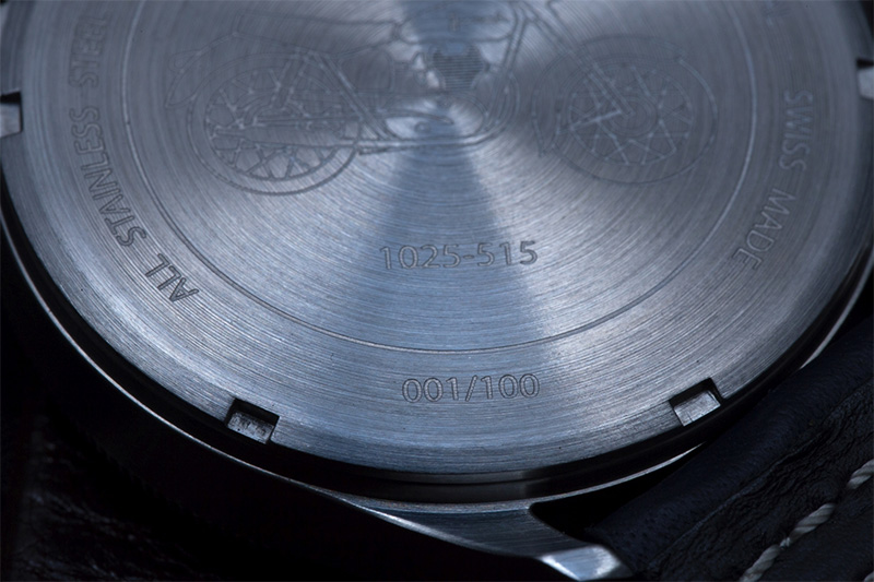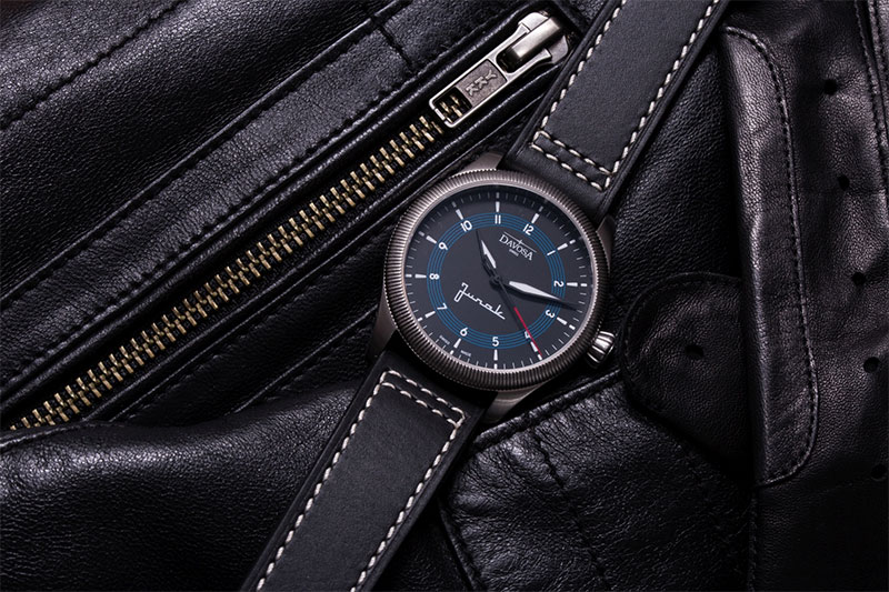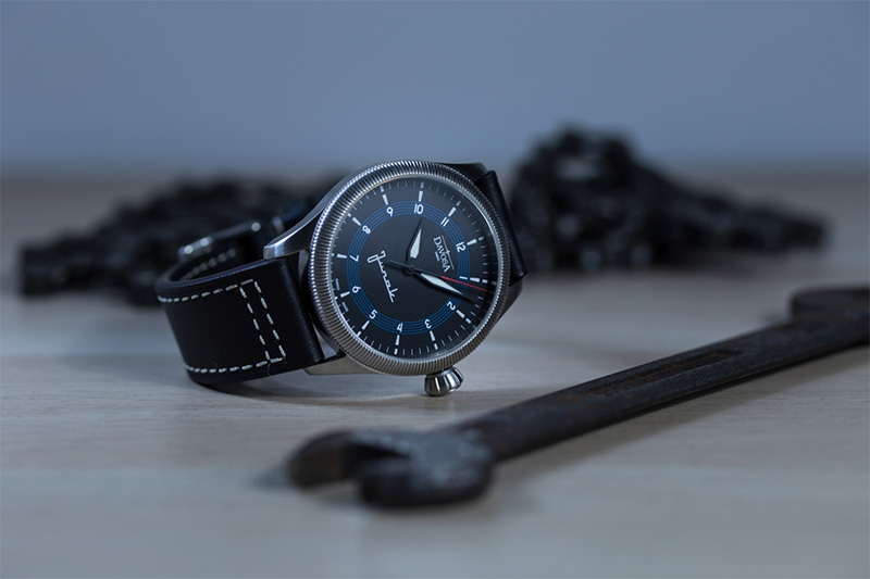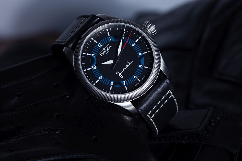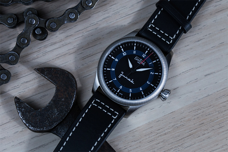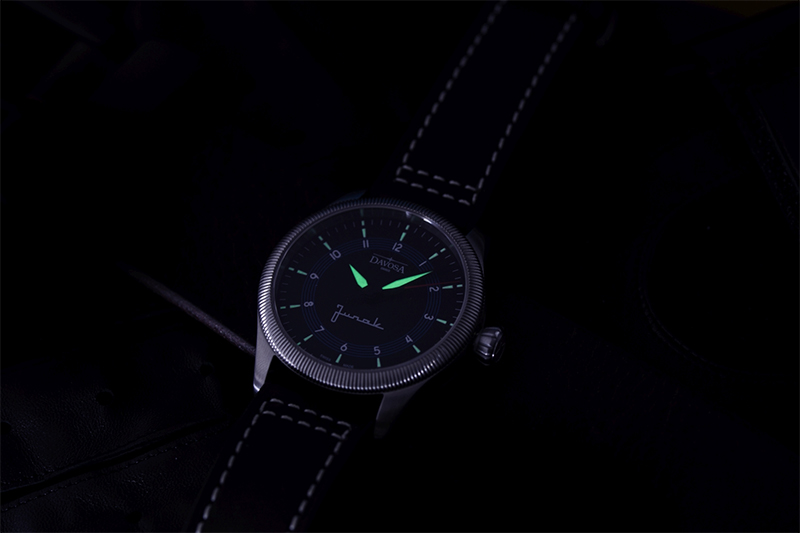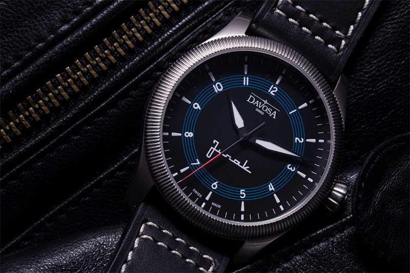 Zegarek Davosa Junak Aviator Limited Edition 162.501.55 to elegancki zegarek z okrągłą tarczą na skórzanym czarnym pasku. Koperta otrzymała rozmiar 42 mm, co jest wartością optymalną dla tego typu czasomierzy i wykonana została ze stali szlachetnej 316L. Stal jest materiałem bardzo wytrzymałym, poddającym się dość łatwej obróbce, co pozwala na tworzenie kopert i bransolet o niesamowitych kształtach. Wysokiej jakości skórzany pasek został idealnie dopasowany do obudowy, dzięki czemu możemy liczyć na bardzo wysoki komfort użytkowania. Tarcza otrzymała wyraziste indeksy oraz wskazówki w białym kolorze, które idealnie kontrastują z czarno-niebieską, bardzo czytelną tarczą zegarka. Ciekawa tarcza w kolorze czarnym z akcentami niebieskimi nawiązuje do minimalistycznego designu prędkościomierza polskiego motocykla. Mocny, skórzany pasek w kolorze czarnym posiada białe szycie, idealnie komponuje się z wyglądem czasomierza. Od spodu zegarka, na deklu koperty umieszczono m.in. grafikę legendarnego motocykla oraz informację o wodoszczelności zegarka i numer limitacji. Wodoszczelność została ustalona na poziomie 50 m/5 ATM, co wydaje się być wartością wręcz idealną. Zachlapanie, mycie rąk a nawet deszcz nie spowodują przykrych dolegliwości, które mogą mieć wpływ na pracę mechanizmu. Czasomierz napędzany jest poprzez najwyższej jakości szwajcarski mechanizm kwarcowy zasilany baterią. Jest to oczywiście mechanizm, który zapewni nam precyzję i dokładność chodu na najwyższym poziomie.