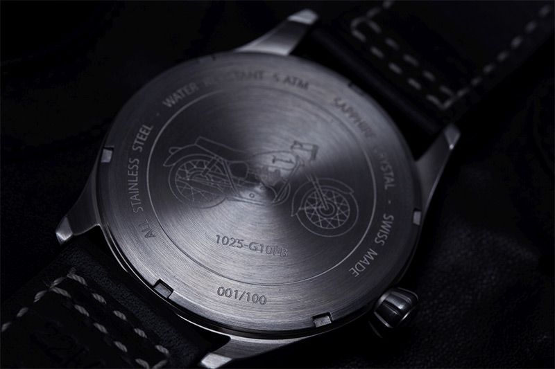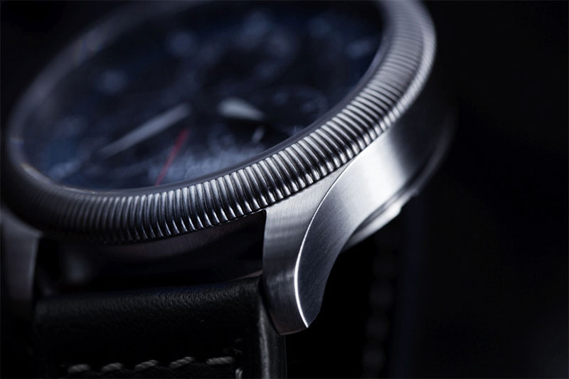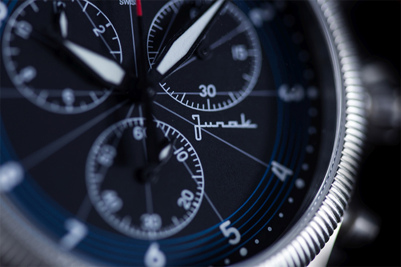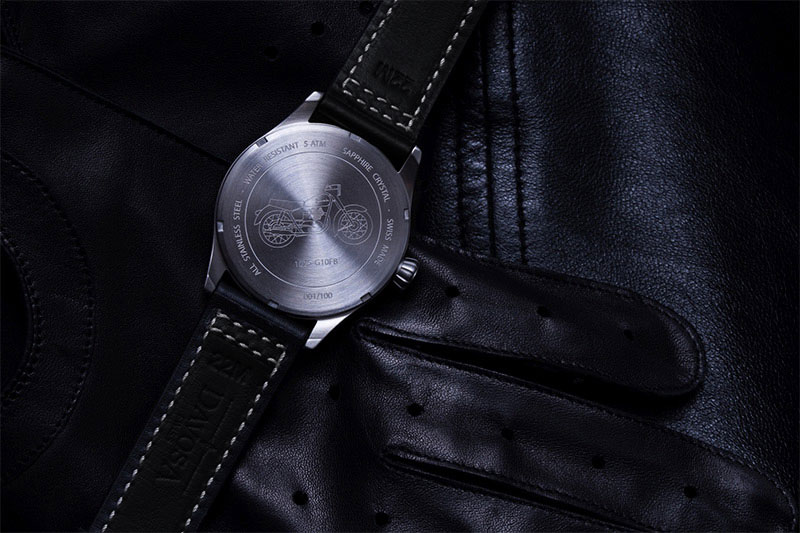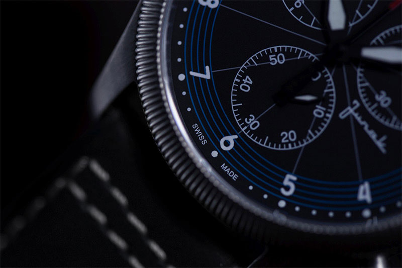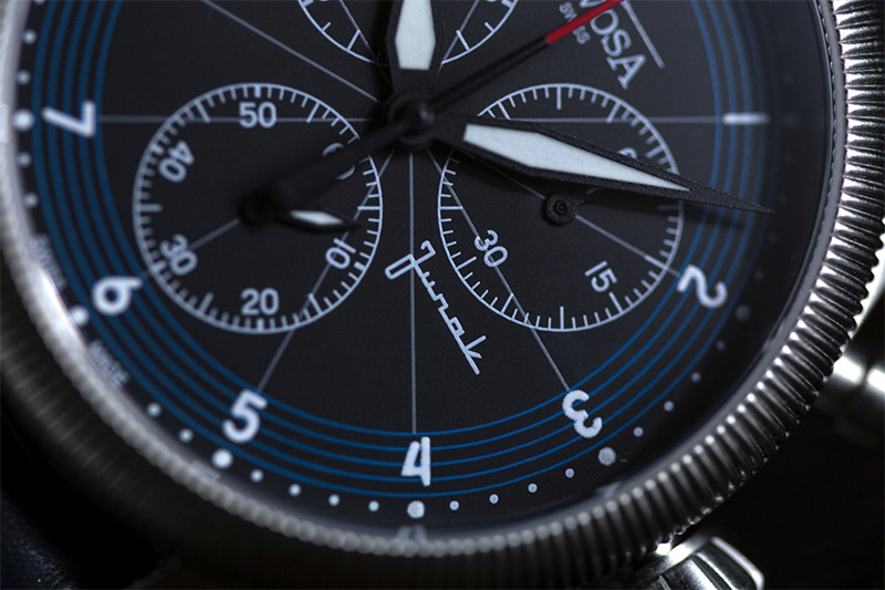 Zegarek Davosa Junak Chrono Limited Edition 162.502.55 to elegancki zegarek z okrągłą tarczą na skórzanym czarnym pasku. Koperta otrzymała rozmiar 42 mm, co jest wartością optymalną dla tego typu czasomierzy i wykonana została ze stali szlachetnej 316L. Stal jest materiałem bardzo wytrzymałym, poddającym się dość łatwej obróbce, co pozwala na tworzenie kopert i bransolet o niesamowitych kształtach. Wysokiej jakości skórzany pasek został idealnie dopasowany do obudowy, dzięki czemu możemy liczyć na bardzo wysoki komfort użytkowania. Tarcza otrzymała wyraziste indeksy oraz wskazówki w białym kolorze, które idealnie kontrastują z czarno-niebieską, bardzo czytelną tarczą zegarka. Ciekawa tarcza w kolorze czarnym z akcentami niebieskimi nawiązuje do minimalistycznego designu prędkościomierza polskiego motocykla. Mocny, skórzany pasek w kolorze czarnym posiada białe szycie, idealnie komponuje się z wyglądem czasomierza. Od spodu zegarka, na deklu koperty umieszczono m.in. grafikę legendarnego motocykla oraz informację o wodoszczelności zegarka i numer limitacji. Wodoszczelność została ustalona na poziomie 50 m/5 ATM, co wydaje się być wartością wręcz idealną. Zachlapanie, mycie rąk a nawet deszcz nie spowodują przykrych dolegliwości, które mogą mieć wpływ na pracę mechanizmu. Davosa Junak wyposażono w wysokiej klasy mechanizm kwarcowy na baterię, szwajcarskiej firmy ETA G10 z funkcją „Fly Back”. Naciśnięcie przycisku zatrzymuje bieżący pomiar czasu, a wskazówka wraca do zera; po zwolnieniu popychacza rozpoczyna się nowy proces stopera. Pozwala to zaoszczędzić istotne sekundy, które mogą okazać się decydujące podczas wyścigu: zdecydowana przewaga funkcji Fly-Back w przeciwieństwie do tradycyjnej funkcji stopera chronografu. Jest to oczywiście mechanizm, który zapewni nam precyzję i dokładność chodu na najwyższym poziomie.