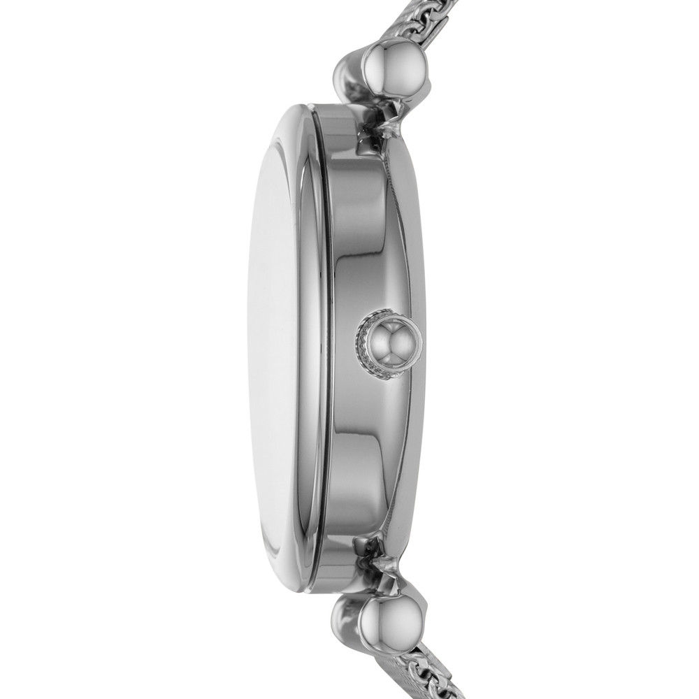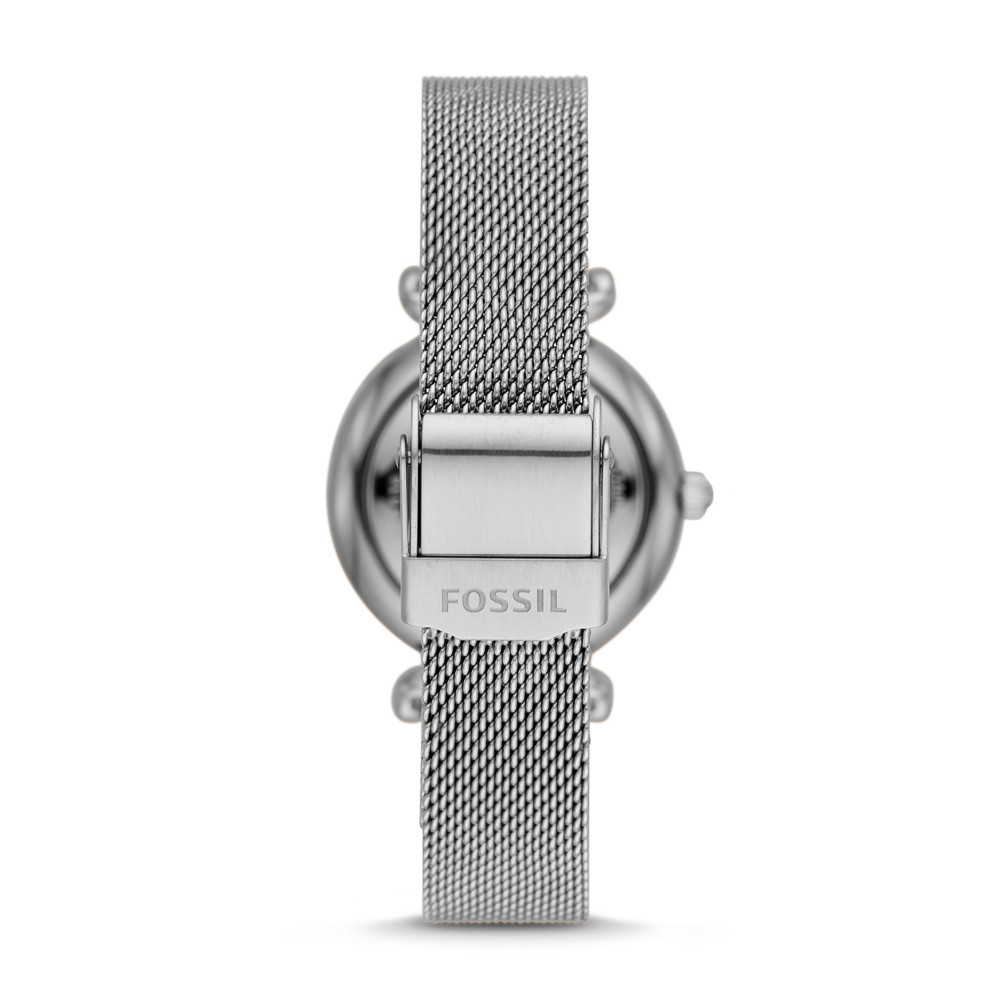 Zegarek FOSSIL CARLIE MINI ES4837 to klasyczny zegarek z okrągłą tarczą na srebrnej bransolecie typu mesh. Srebrna koperta otrzymała rozmiar 28 mm, co jest wartością optymalną dla tego typu czasomierzy i wykonana została ze stali szlachetnej 316L. Stal jest materiałem bardzo wytrzymałym, poddającym się dość łatwej obróbce, co pozwala na tworzenie kopert i bransolet o niesamowitych kształtach. Wykonana z wysokiej jakości stali bransoleta, została idealnie dopasowana do obudowy, dzięki czemu możemy liczyć na bardzo wysoki komfort użytkowania. Tarcza otrzymała wyraziste indeksy oraz wskazówki w srebrnym kolorze, które idealnie kontrastują z jasną, bardzo czytelną tarczą zegarka. Wykonany z masy perłowej cyferblat oraz ozdobne kamienie, ożywiają czasomierz i nadają mu odpowiedniego charakteru. Wodoszczelność została ustalona na poziomie 30 m/3 ATM, co wydaje się być wartością wręcz idealną. Zachlapanie, mycie rąk a nawet deszcz nie spowodują przykrych dolegliwości, które mogą mieć wpływ na pracę mechanizmu. Czasomierz napędzany jest poprzez najwyższej jakości japoński mechanizm kwarcowy zasilany baterią. Jest to oczywiście mechanizm, który zapewni nam precyzję i dokładność chodu na najwyższym poziomie.