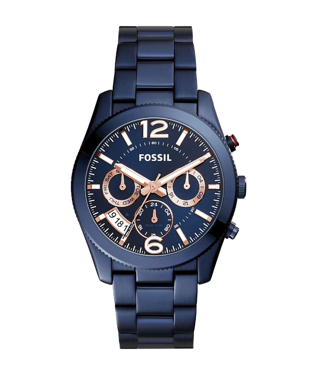 Nowoczesny, sportowy, damski model Fossil PERFECT BOYFRIEND ES4093 na bransolecie w modnym kolorze z bardzo ciekawą tarczą. Gdzie wskazówki oraz sumatory rozbudowanego kalendarza wykonano w kolorze różowego złota. Dodatkową funkcją jest wskaźnik 24 godzinny oraz subtarcza drugiej strefy umożliwiająca jednoczesny podgląd godziny w dowolnym miejscu. Całość w oryginalnej granatowej powłoce PVD sprawia niesamowite wrażenie i gwarantuje sukces przy kompletowaniu stylizacji.