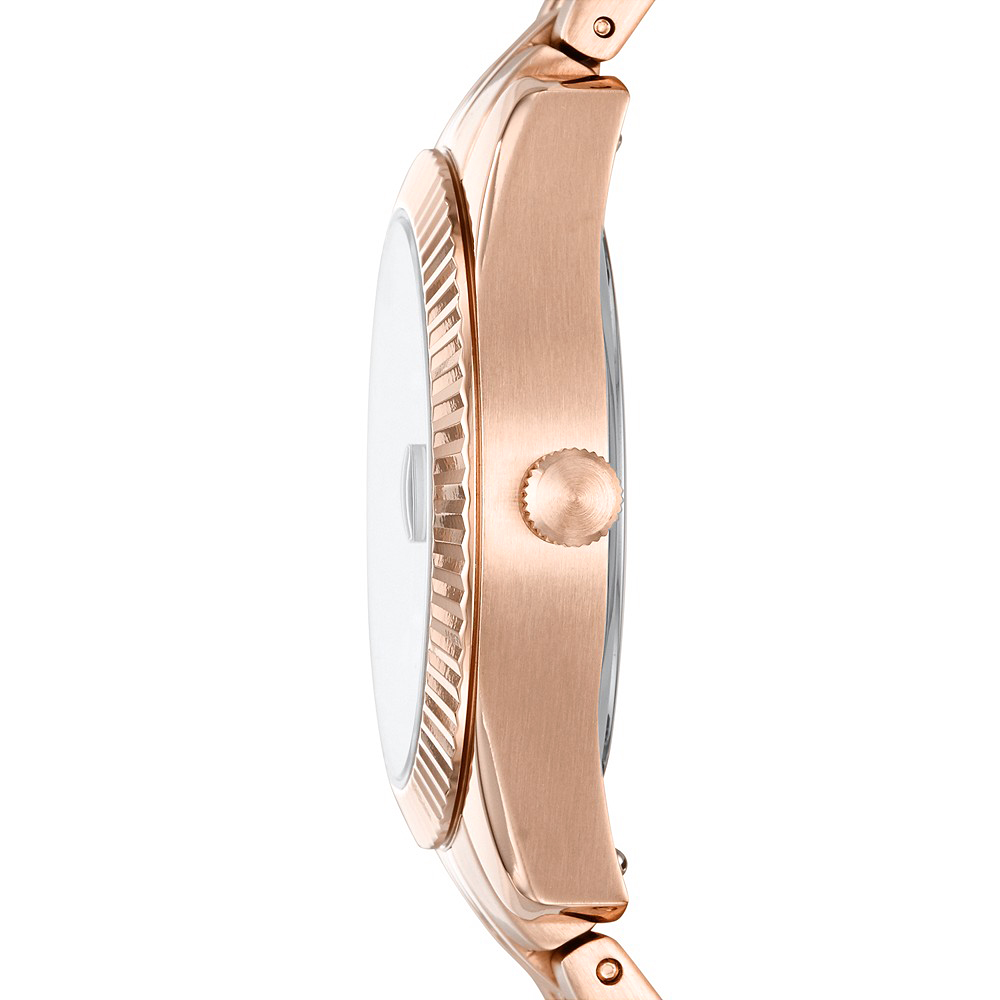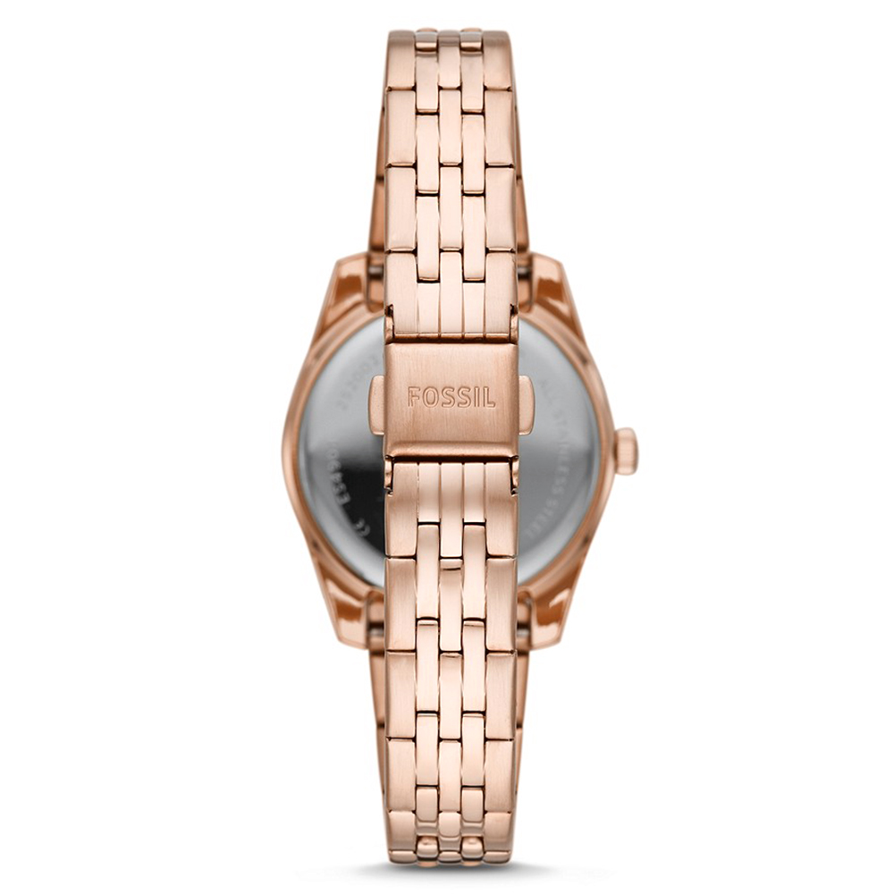 Fossil Scarlette Mini ES4898 to damski delikatny zegarek w rozmiarze koperty 32 mm i szczelności 30 metrów (klasa podstawowa) Na uwagę zasługuje modna luneta koperty z ciekawym wzorem. Model ten jest zegarkiem na bransolecie, podobnie jak koperta, wykonanej ze stali w powłoce z różowego PVD.