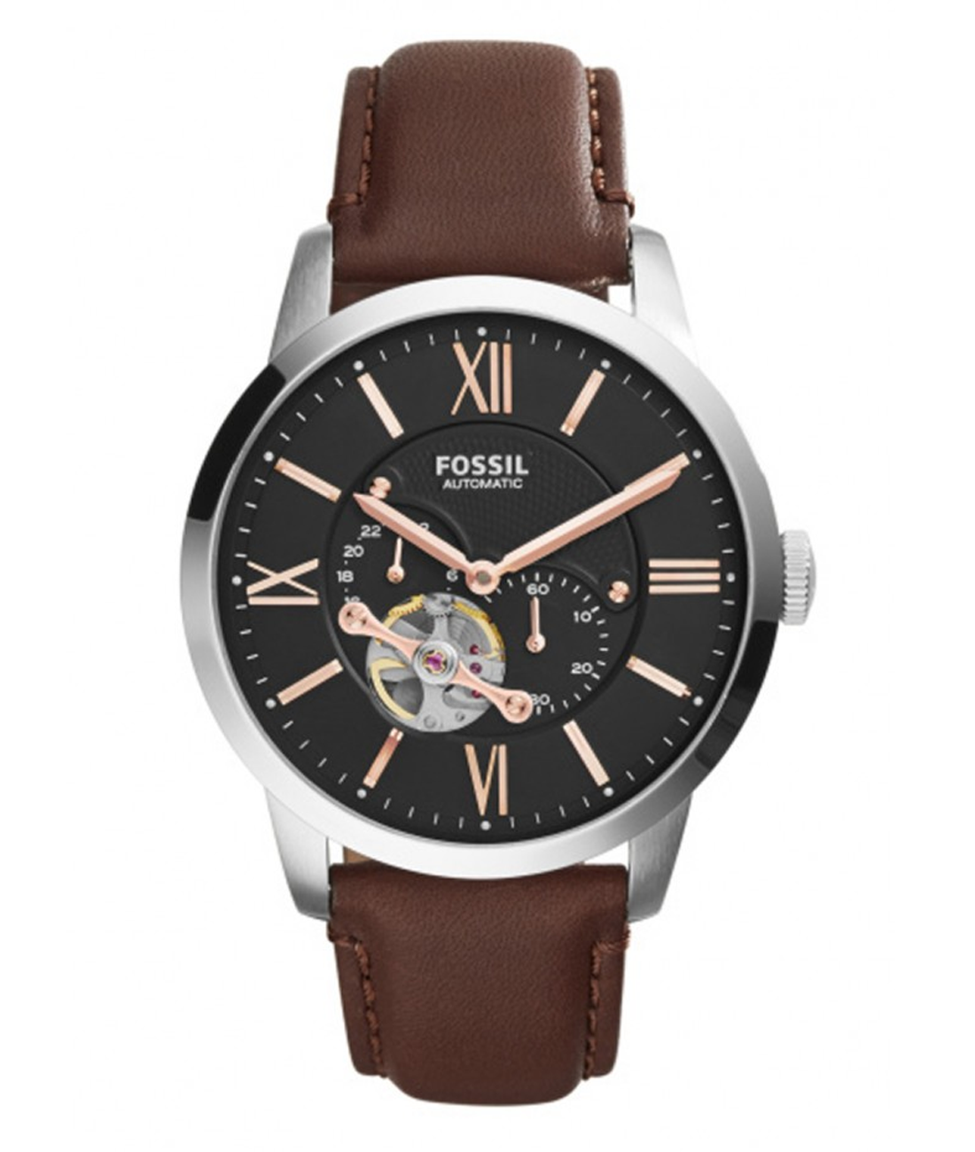 Marka Fossil w swojej kolekcji posiada również tradycyjne modele automatyczne. Najlepszym przykładem tego będzie zegarek FOSSIL TOWNSMAN ME3182 stalowa polerowana koperta, z tarczą typu „open heart” ukazująca automatyczne serce zegarka. Tarcza posiada kolor czarny, na który naniesiono wskazówki i indeksy w kolorze różowego złota.