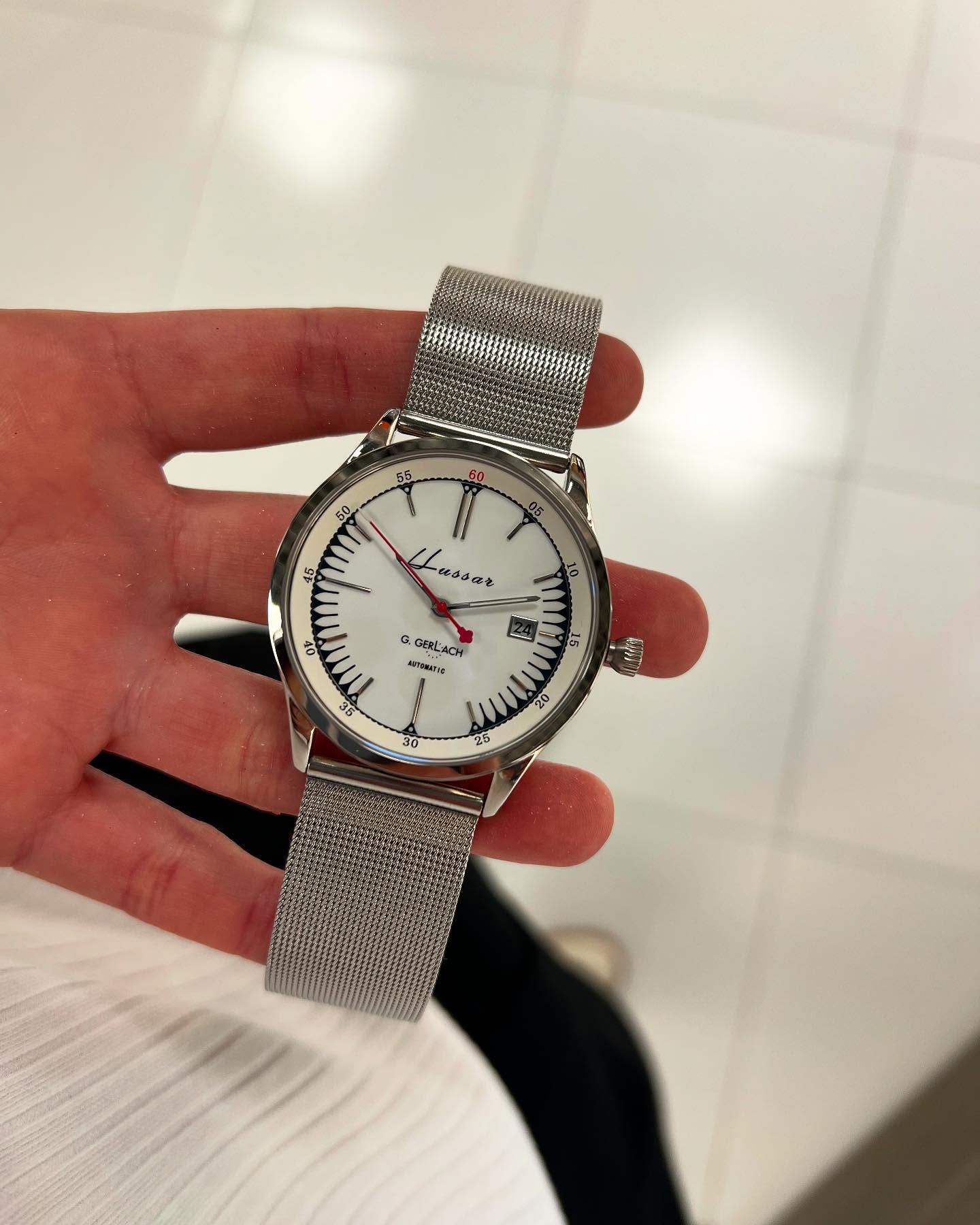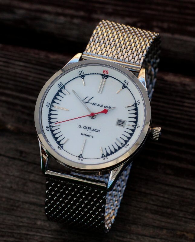 I tak powstał zatem model Gerlach Husaria który przy swoich gabarytach – szerokości 41 i grubości poniżej 10 mm – spełnia definicję zegarka garniturowego, jednocześnie jednak wyróżnia się na ich tle masywnością i zwartością konstrukcji. By zapewnić mu należytą wodoszczelność – w tym przypadku WR100/10ATM – sięgnięto po stosunkowo nowy na rynku mechanizm. Jest nim Miyota 9015, której grubość 3.9 mm pozwoliła na użycie wymaganych konstrukcyjnie grubości zarówno dekla, jak i szafirowego szkła. Użyto klasycznej, emaliowanej tarczy, na której w sposób subtelny oddano symbolikę husarskich skrzydeł. Smukłe wskazówki to broń husarza – patrząc na nie widzimy koncerz, szablę, a także kopię. Jury doceniło w tym zakresie zwłaszcza delikatność symboliki, bez wpływu na jej wyrazistość. Całość uzupełnia meshowa, stalowa bransoleta.