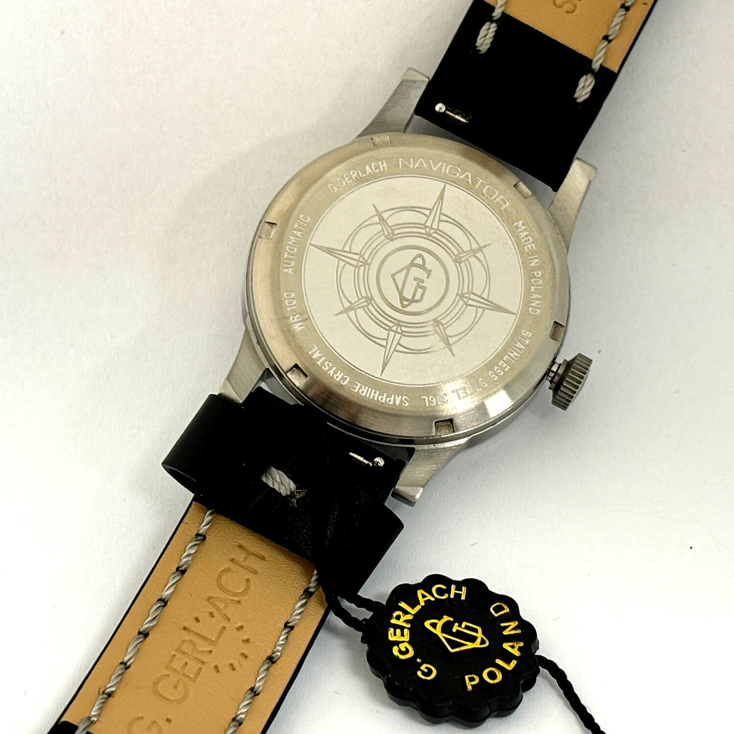 Zegarek Gerlach Navigator MK 3 GMT to kolejny w rodzinie Gerlach model z serii morskich. O znakomitej czytelności tarczy, która jest grafitowa, I pięknie komponuje się z pomarańczowymi wskazówkami. Zegarek ten poza tradycyjnymi wskazaniami godzin oraz daty, wyposażono w moduł GMT. Dzięki niemu możemy mieć aktualne wskazanie godziny w innej strefie czasowej. Które realizowane jest dzięki dodatkowej wskazówce, a odczytywane z wewnętrznego pierścienia z oznaczeniami godzin. To co wyróżnia ten zegarek na tle konkurencji to wspomniany rozmiar koperty, 39mm w której udało zmieścić się mechanizm o dodatkowych wskazaniach. Daje to szanse osobom z węższym przegubem na zakup ciekawego modelu.