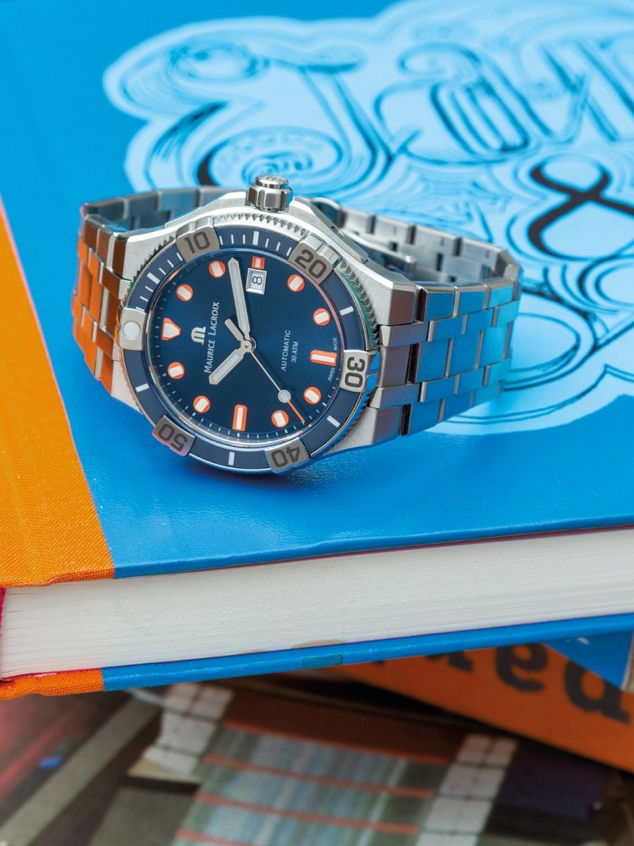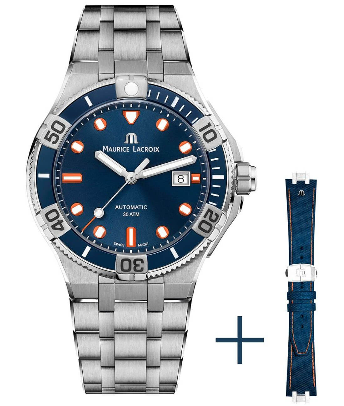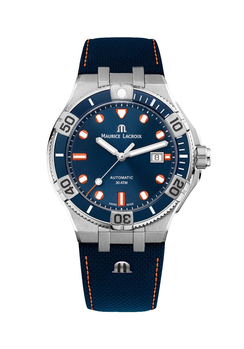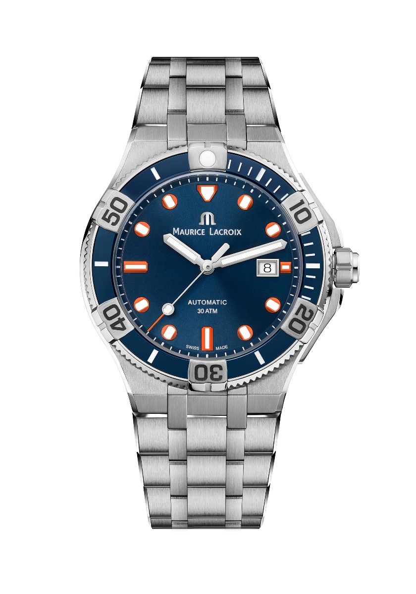 Limited Edition AI6058-SS002-431-1 kolekcja Aikon tym razem w oryginalnej limitowanej wersji diver. Konstruktorzy z Maurice Lacroix doszli do wniosku że bazowy model Aikon będzie świetnym pierwowzorem do stworzenia rasowego zegarka nurkowego. Granatowa tarcza z pomarańczowymi wstawkami (indeksy) oraz obrotowy pierścień z niebieskimi elementami robią duże wrażenie. Dodatkowo znana, solidna bransoleta nie pozostawiają złudzeń że mamy do czynienia z solidnym zegarkiem.