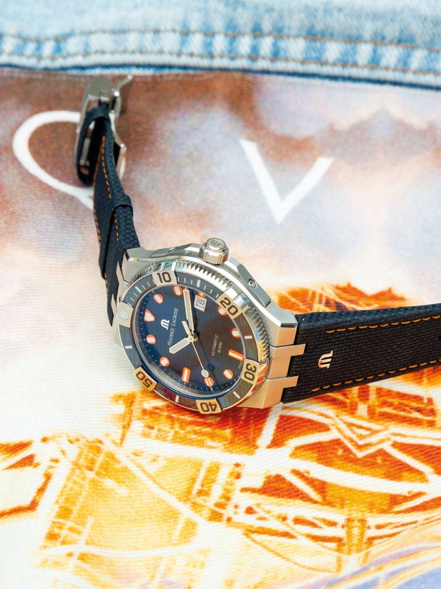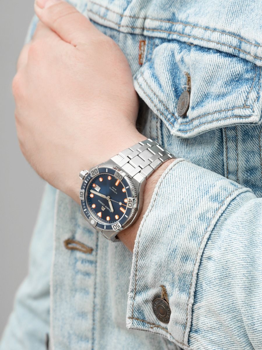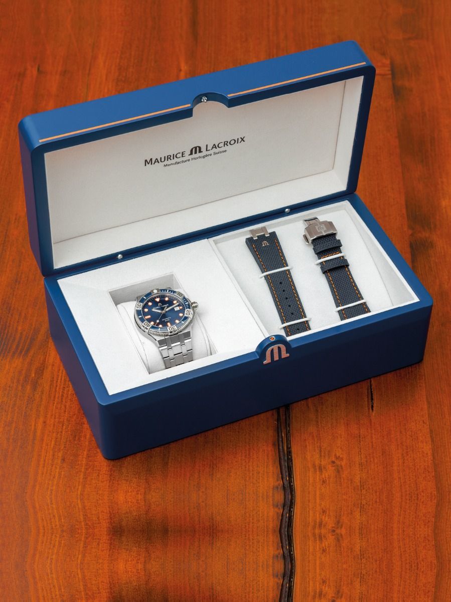 Limited Edition AI6058-SS002-431-1 kolekcja Aikon tym razem w oryginalnej limitowanej wersji diver. Konstruktorzy z Maurice Lacroix doszli do wniosku że bazowy model Aikon będzie świetnym pierwowzorem do stworzenia rasowego zegarka nurkowego. Granatowa tarcza z pomarańczowymi wstawkami (indeksy) oraz obrotowy pierścień z niebieskimi elementami robią duże wrażenie. Dodatkowo znana, solidna bransoleta nie pozostawiają złudzeń że mamy do czynienia z solidnym zegarkiem.