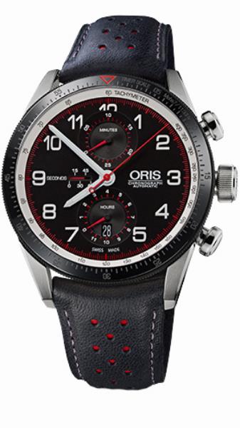 Oris Calobra Limited Edition 774 7661 4484 LS Zegarek Oris w limitowanej specjalnej edycji. Masywna stalowa koperta skrywa mechanizm o naciągu automatycznym. Aby podkreślić sportowy charakter czasomierza wyposażono go w stoper ze skalą tachometru.