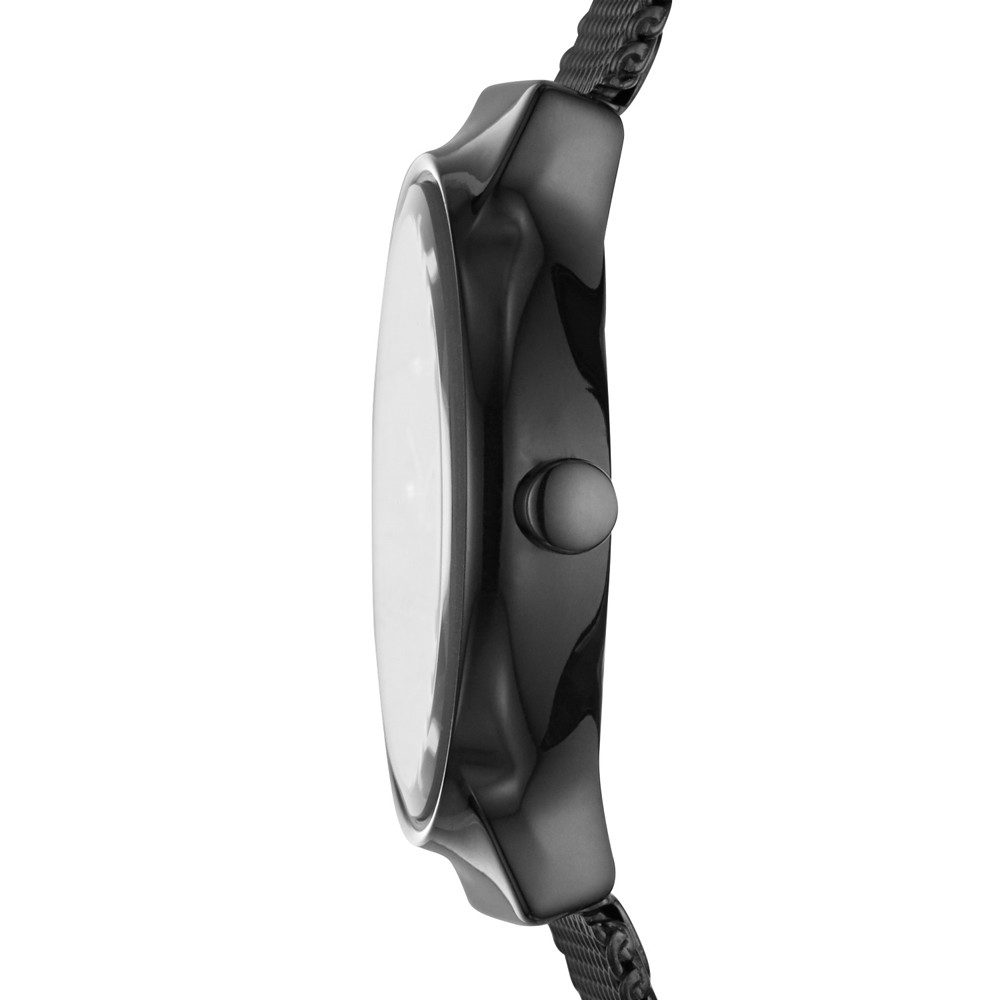 Zegarek Skagen SKW2747 to klasyczny zegarek z okrągłą tarczą na czarnej bransolecie typu mesh. Koperta otrzymała rozmiar 26 mm, co jest wartością optymalną dla tego typu czasomierzy i wykonana została ze stali szlachetnej 316L. Bransoleta została idealnie dopasowana do obudowy, a sposób łączenia ogniw powoduje, że możemy liczyć na wysoki komfort użytkowania. Zarówno koperta jak i bransoleta zostały poczernione metodą PVD, dzięki czemu możemy liczyć na wręcz idealne odwzorowanie głębokiej czerni. Tarcza otrzymała wyraziste indeksy i wskazówki w białym kolorze, które idealnie kontrastują z czarnym cyferblatem. Kryształki Swarovskiego umieszczony na tarczy, ożywiają czasomierz i nadają mu odpowiedniego charakteru. Wodoszczelność została ustalona na poziomie 50 m/5 ATM, co wydaje się być wartością wręcz idealną. Zachlapanie, mycie rąk a nawet deszcz nie spowodują przykrych dolegliwości, które mogą mieć wpływ na pracę mechanizmu. Czasomierz napędzany jest poprzez najwyższej jakości japoński mechanizm kwarcowy zasilany baterią. Jest to oczywiście mechanizm, który zapewni nam precyzję i dokładność chodu na najwyższym poziomie.
