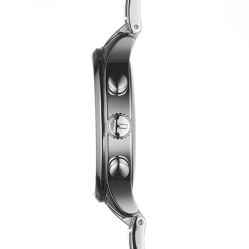 Przeciwwaga wskazówki sekundowej (element po przeciwnej stronie niż wskazująca część wskazówki) jest ukształtowana w literę „T” – wskazującą markę producenta zegarka.Na dodatkowy plus zasługuje bardzo czytelne, klasyczne wskazania stopera. Zegarek wyposażono w precyzyjny i niezawodny szwajcarski mechanizm kwarcowy.