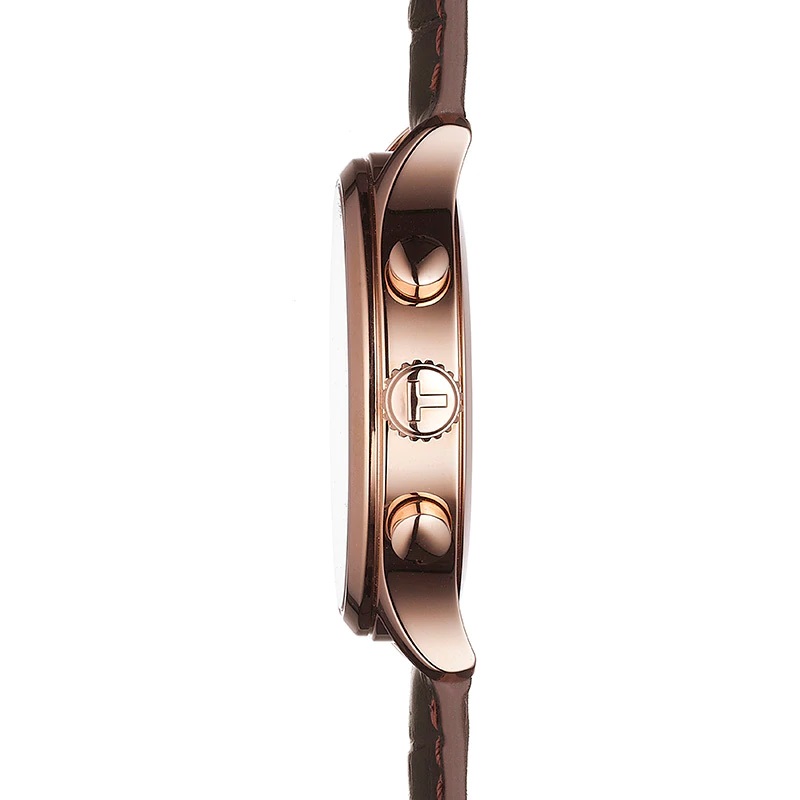 Zegarek Tissot Chrono XL T116.617.36.057.01 to elegancki męski zegarek na skórzanym pasku. Pozłacana dzięki metodzie PVD koperta otrzymała rozmiar 45 mm, co jest wartością optymalną dla tego typu czasomierzy i wykonana została ze stali szlachetnej 316L. Dzięki odpowiedniej technice pozłacania elementów stalowych, mamy pewność, że koperta nie straci swoich walorów wizualny przez wiele lat. Stal jest materiałem bardzo wytrzymałym, poddającym się dość łatwej obróbce, co pozwala na tworzenie kopert i bransolet o niesamowitych kształtach. Wykonany z naturalnej skóry pasek, został idealnie dopasowany do obudowy, dzięki czemu możemy liczyć na bardzo wysoki komfort użytkowania. Na uwagę zasługuje bardzo wygodne zapięcie motylkowe, które ułatwia zakładanie i zdejmowanie zegarka. Tarcza otrzymała wyraziste cyfry arabskie oraz wskazówki w złotym kolorze, które idealnie kontrastują z grafitową, bardzo czytelną tarczą zegarka. Odpowiednio wykonany cyferblat, liczniki chronografu oraz okienko datownika umieszczone na godz. 4 ożywiają czasomierz i nadają mu odpowiedniego charakteru. Stoper – powszechnie nazywany także „chronografem” to dodatkowy moduł zegarka pozwalające na pomiar krótkich odcinków czasu. Rozbudowany stoper może pozwalać także na pomiar międzyczasów – stoper z doganiającą wskazówką (Rattrapante). W celu zapewnienia odpowiedniej przejrzystości oraz wytrzymałości Tissot stosuje najwyższej jakości szkła szafirowe, które oferują celującą wręcz odporność na zarysowania. Wodoszczelność została ustalona na poziomie 100 m/10 ATM, co wydaje się być wartością wręcz idealną. Zachlapanie, mycie rąk a nawet deszcz nie będą mieć wpływu na pracę mechanizmu. Czasomierz napędzany jest poprzez najwyższej jakości szwajcarski mechanizm kwarcowy zasilany baterią. Jest to oczywiście mechanizm, który zapewni nam precyzję i dokładność chodu na najwyższym poziomie.