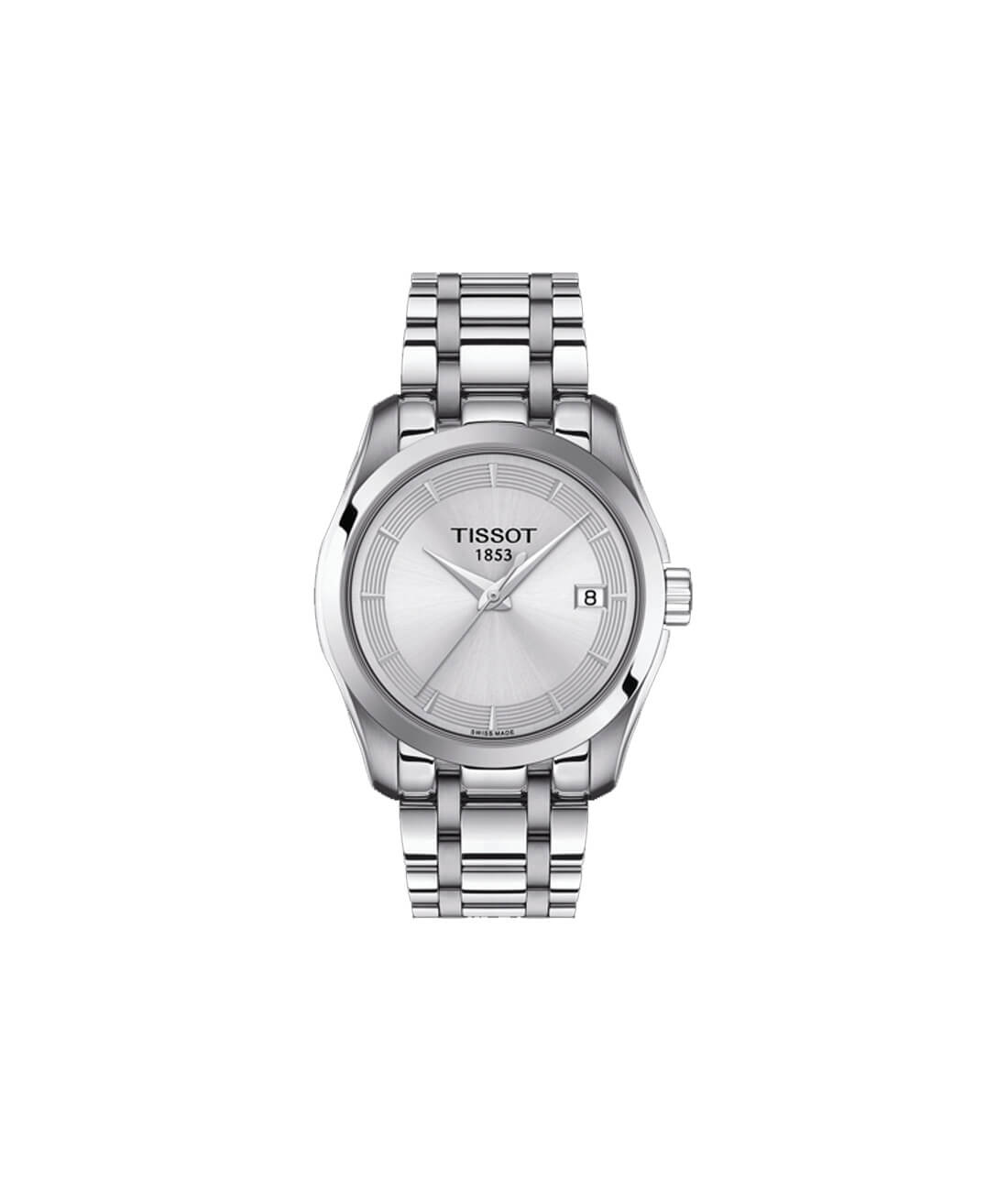 Zegarek Tissot Couturier Lady T035.210.11.031.00 to elegancki damski zegarek na stalowej solidnej bransolecie. Koperta otrzymała rozmiar 32 mm, co jest wartością optymalną dla tego typu czasomierzy i wykonana została ze stali szlachetnej 316L. Stal jest materiałem bardzo wytrzymałym, poddającym się dość łatwej obróbce, co pozwala na tworzenie kopert i bransolet o niesamowitych kształtach. Wykonana z perfekcyjnie połączonych ogniw bransoleta, została idealnie dopasowana do obudowy, dzięki czemu możemy liczyć na bardzo wysoki komfort użytkowania. Na uwagę zasługuje bardzo wygodne zapięcie, które ułatwia zakładanie i zdejmowanie zegarka. Tarcza otrzymała wyraziste indeksy oraz wskazówki w srebrnym kolorze, które idealnie kontrastują z jasną, bardzo czytelną tarczą zegarka. Odpowiednio wykonany cyferblat oraz okienko datownika umieszczone na godz. 3 ożywiają czasomierz i nadają mu odpowiedniego charakteru. W celu zapewnienia odpowiedniej przejrzystości oraz wytrzymałości Tissot stosuje najwyższej jakości szkła szafirowe, które oferują celującą wręcz odporność na zarysowania. Wodoszczelność została ustalona na poziomie 100 m/10 ATM, co wydaje się być wartością wręcz idealną. Zachlapanie, mycie rąk a nawet deszcz nie będą mieć wpływu na pracę mechanizmu. Czasomierz napędzany jest poprzez najwyższej jakości szwajcarski mechanizm kwarcowy zasilany baterią. Jest to oczywiście mechanizm, który zapewni nam precyzję i dokładność chodu na najwyższym poziomie.