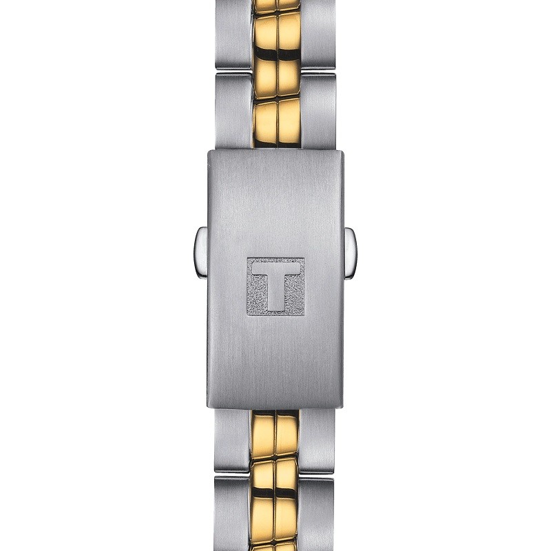 Zegarek Tissot PR100 Lady T101.210.22.031.00 to klasyczny, niezwykle elegancki damski zegarek na stalowo-złotej bransolecie. Pozłacana dzięki metodzie PVD koperta otrzymała rozmiar 33 mm, co jest wartością optymalną dla tego typu czasomierzy i wykonana została ze stali szlachetnej 316L. Stal jest materiałem bardzo wytrzymałym, poddającym się dość łatwej obróbce, co pozwala na tworzenie kopert i bransolet o niesamowitych kształtach. Wykonana z drobnych, polerownych ogniw bransoleta, została idealnie dopasowana do obudowy, dzięki czemu możemy liczyć na bardzo wysoki komfort użytkowania. Tarcza otrzymała wyraziste indeksy oraz wskazówki w złotym kolorze, które idealnie kontrastują z jasną, bardzo czytelną tarczą zegarka. Natomiast perfekcyjnie wykonany cyferblat oraz okienko datownika umieszczone na godz. 6 nadają mu odpowiedniego charakteru. Nasze doznania wizualne potęguje najwyższej jakości szkło szafirowe, które oferuje doskonałą przejrzystość oraz celującą wręcz odporność na wszelkiego rodzaju uszkodzenia czy zarysowania. Wodoszczelność została ustalona na poziomie 100 m/10 ATM, co wydaje się być wartością wręcz idealną. Zachlapanie, mycie rąk, a nawet deszcz nie spowodują przykrych dolegliwości, które mogą mieć wpływ na pracę mechanizmu. Czasomierz napędzany jest poprzez najwyższej jakości szwajcarski mechanizm kwarcowy zasilany baterią. Jest to oczywiście mechanizm, który zapewni nam precyzję i dokładność chodu na najwyższym poziomie.