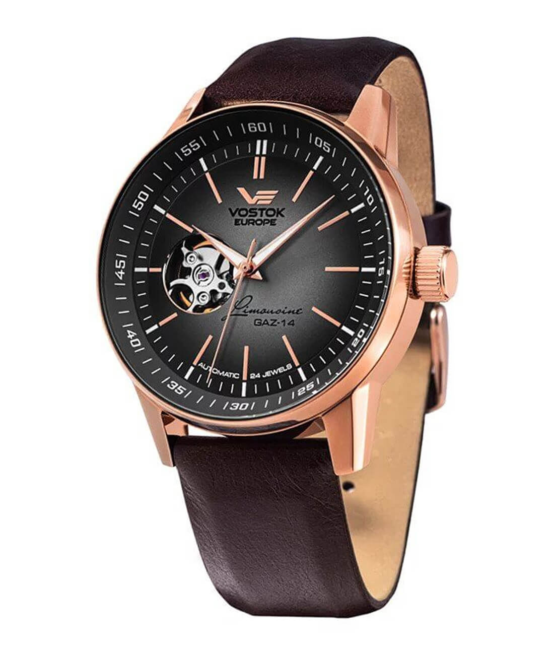 Vostok Europe GAZ-14 Limousine NH38A-560B602 posiada kopertę wykonana ze stali w kolorze różowego złota wykonanej w technologii PVD, w rozmiarze 43mm, o szczelności 50 metrów. Tarcza w odcieniu grafitowego gradientu z indeksami oraz wskazówkami w kolorze koperty, na wysokości godziny 9 widzimy otwór „open heart” ukazujący element mechaniczny mechanizmu, co jest piękną ozdobą oraz podkreśleniem właściwości zegarka. W modelu tym zastosowano szkło mineralne o dobrych właściwościach i odporności na przypadkowe uszkodzenia. Zegarek zasilany jest automatycznym mechanizmem ze stajni Seiko kaliber NH38A, kopertę połączono z paskiem w brązowym kolorze o gładkiej strukturze.