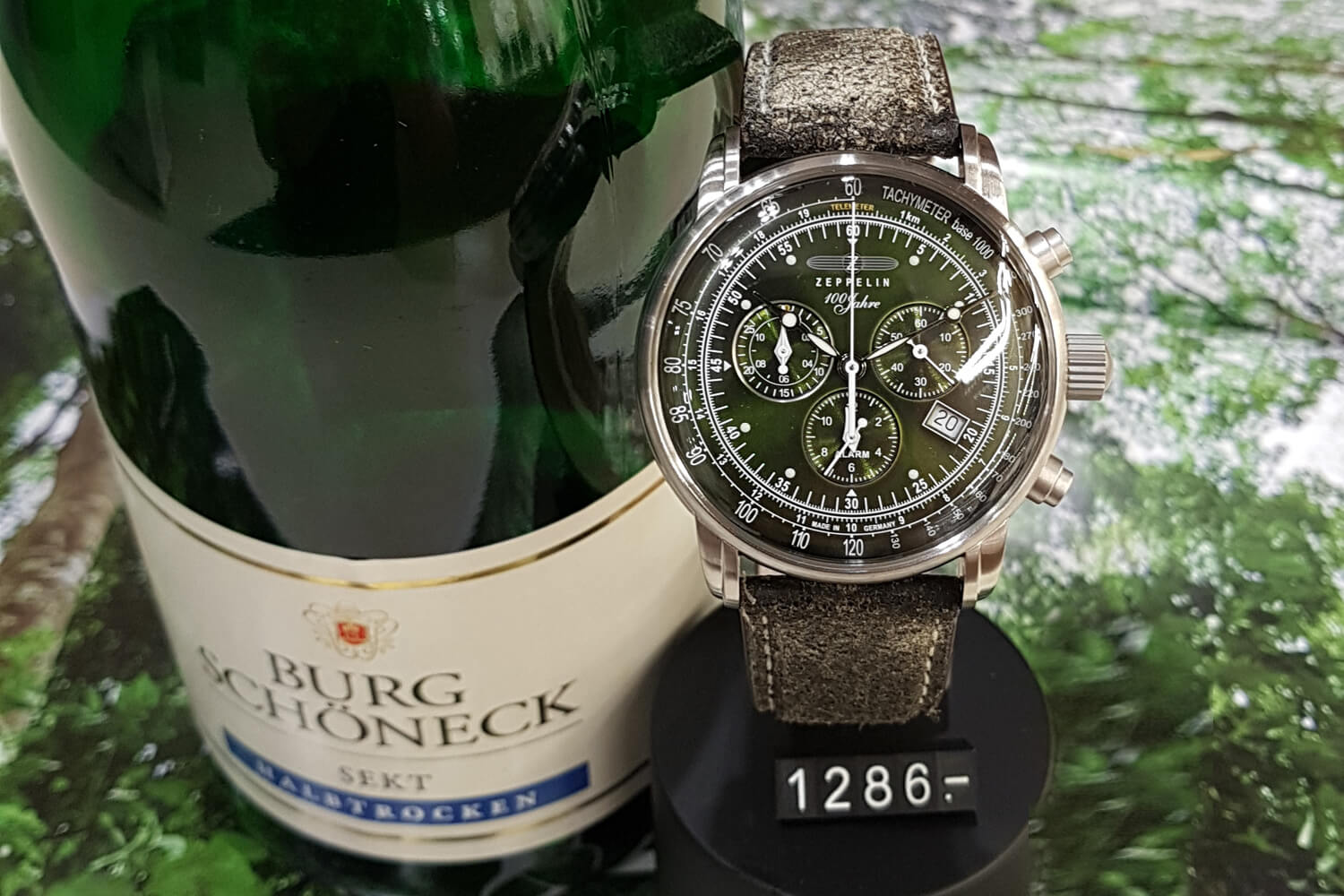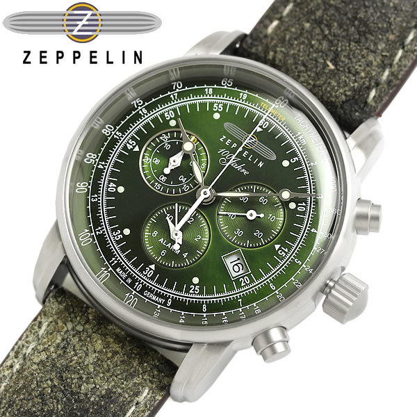 Zeppelin 100 YEARS 8680-4 to zegarek o znanej z innych wyrobów tej marki linii koperty. Profilowane mineralne szkło z wąską ramką, przyciąga uwagę. Bogata, tym razem ciemno zielona tarcza ze szlifem słonecznym wyposażona w stoper, alarm, datę oraz tarczę telemetru sprawia wrażenie mało czytelnej co jest tylko złudzeniem. Doskonałe proporcje i kształt koperty, w stali wysokiej jakości o rozmiarze 42 mm i szczelności 50 metrów gwarantują doskonałe właściwości użytkowe.